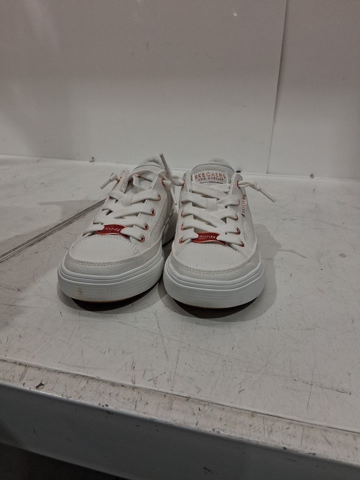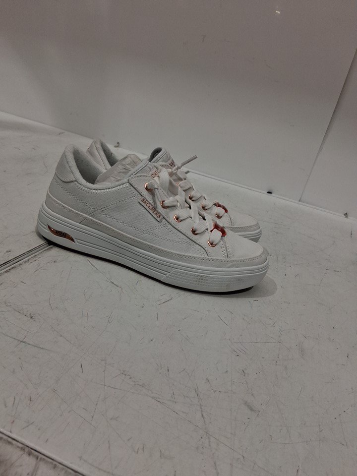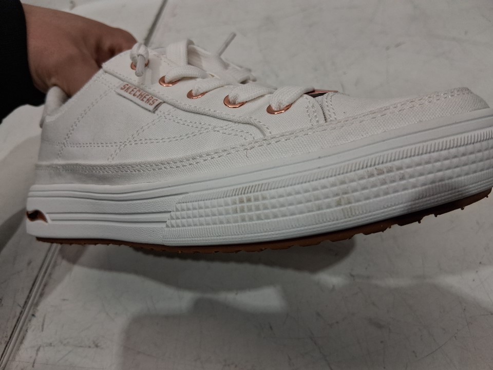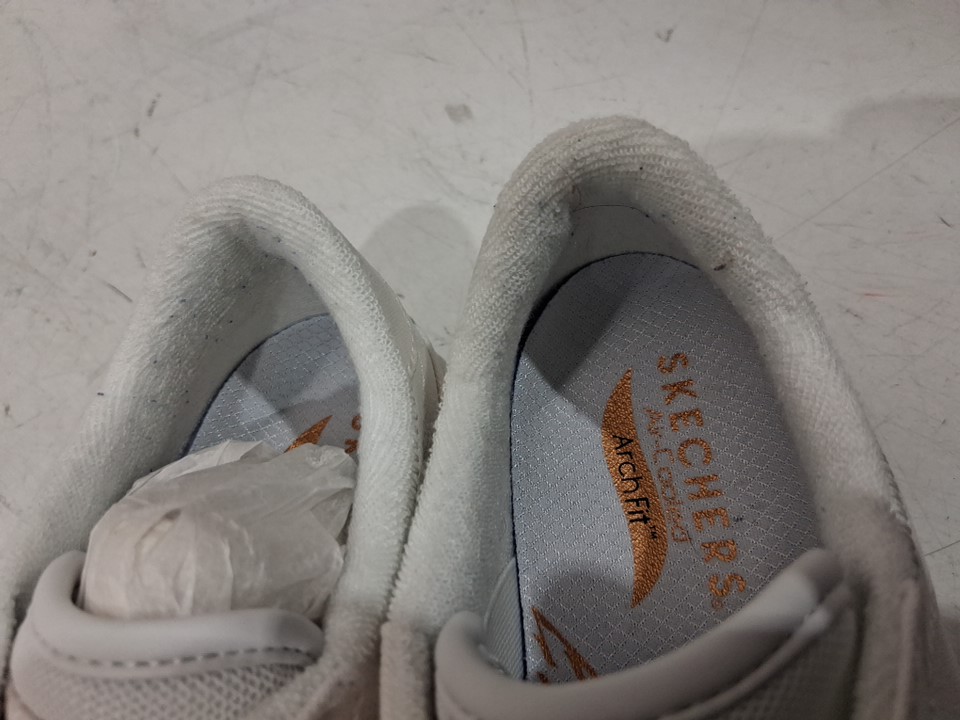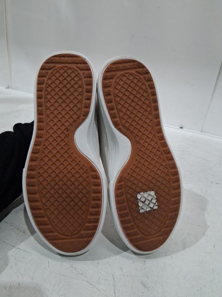 some lint from socks and very faint black scuff marks on the shoes indicating prior use