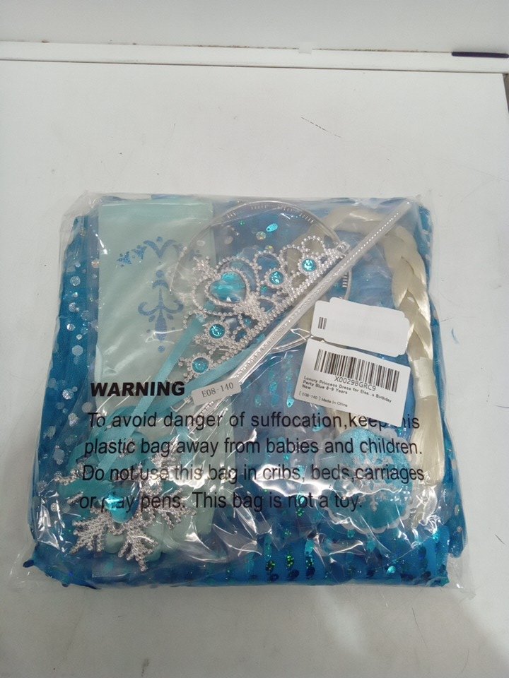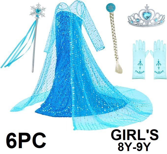 6PC GIRL'S PARTY CHILI ICE PRINCESS DRESS WITH CAPE, GLOVES, TIARA, BRAID, AND WAND - 8 to 9YRS - BLUE