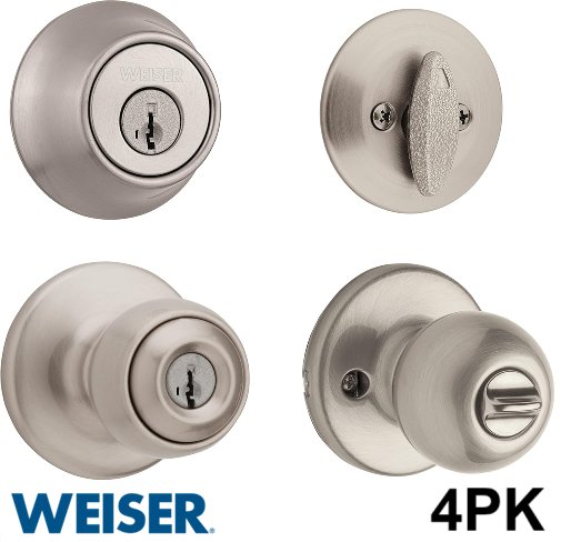 4PK Weiser Yukon Exterior Door Knob AND Deadbolt Combo - BRUSHED NICKEL (MODEL: 9GACS74510-022)