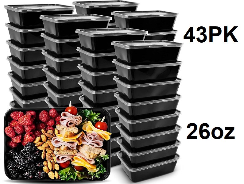 43pk plastic meal prep containers with lids - 26oz - black/clear