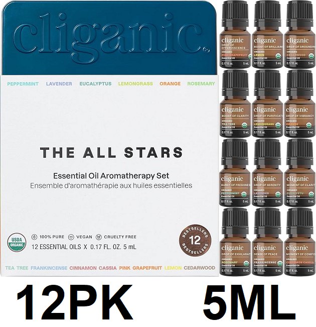 12PK Cliganic Organic Aromatherapy TOP 12 Essential Oils Set - 5ML - ASSORTED SCENTS