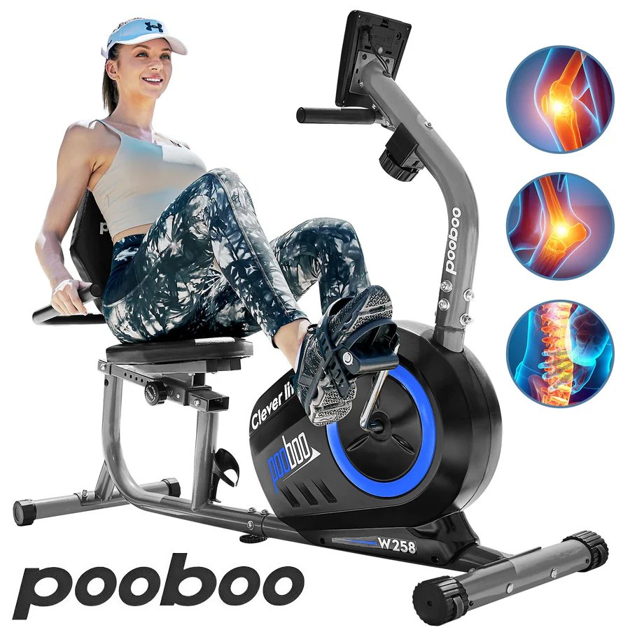 Pooboo Recumbent Exercise Bike with Magnetic Resistance System, Adjustable Cushioned Seat and Backrest, Quiet Belt Drive, LCD Digital Monitor Pulse Sensors for and Transport Wheels (Model: W258)