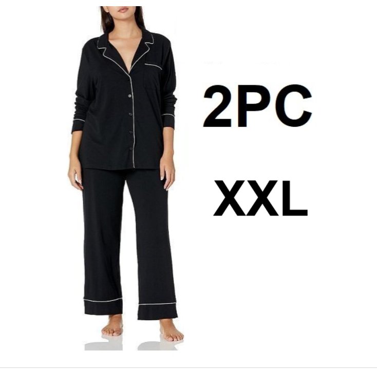 2PC WOMEN'S Amazon Essentials Cotton Modal Long Sleeve Shirt Full Length Pant Pajama Set - XXL - BLACK (STYLE:AEW30115F21)