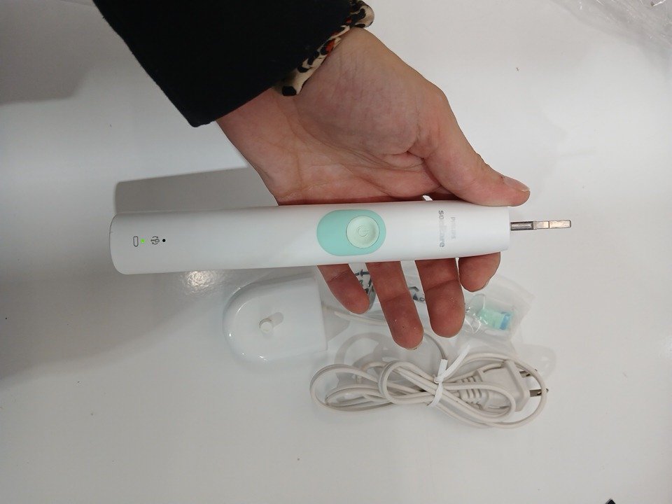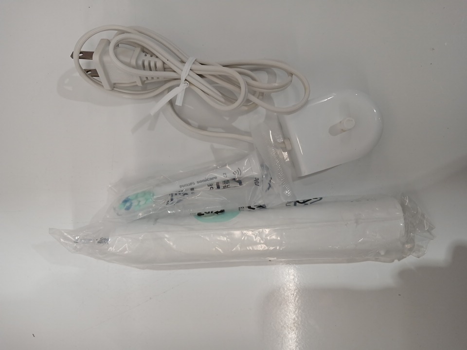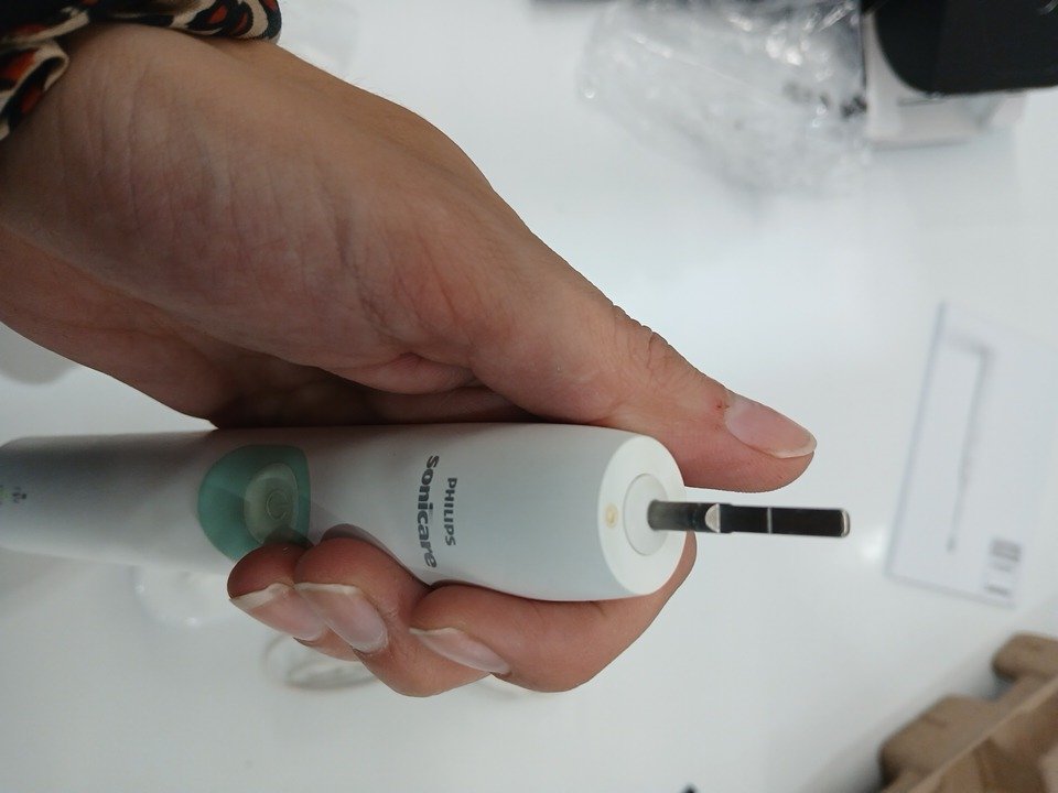 There is a bit of toothpaste residue on the brush handle and one of the included brush heads came opened. We have replaced the opened brush head with a sealed one. Please see photos.