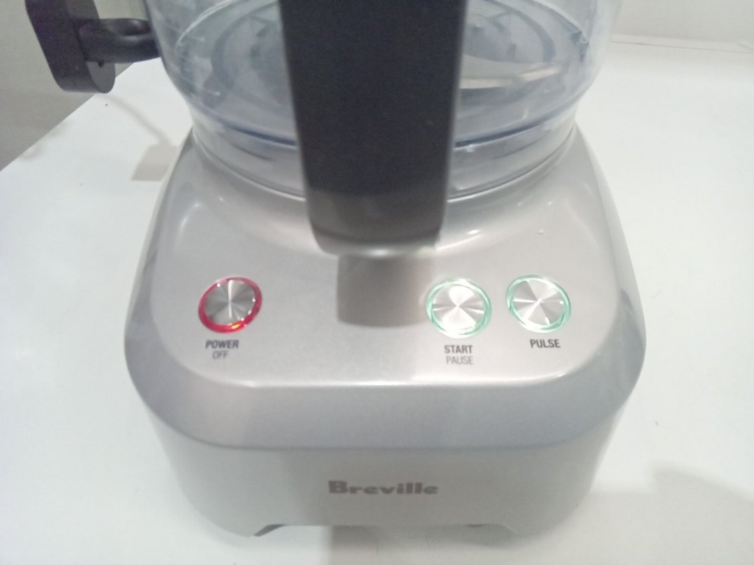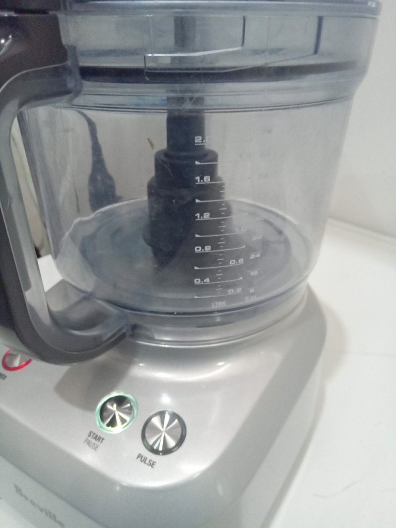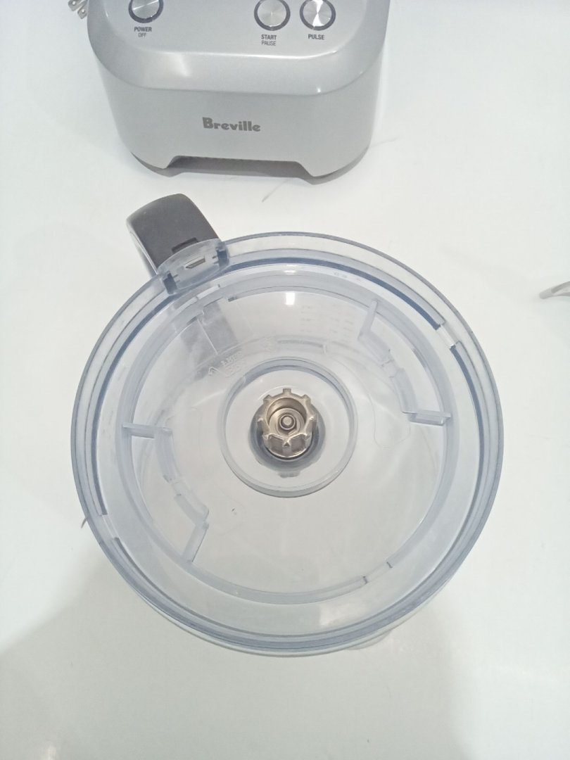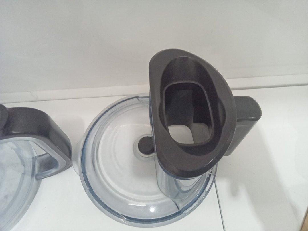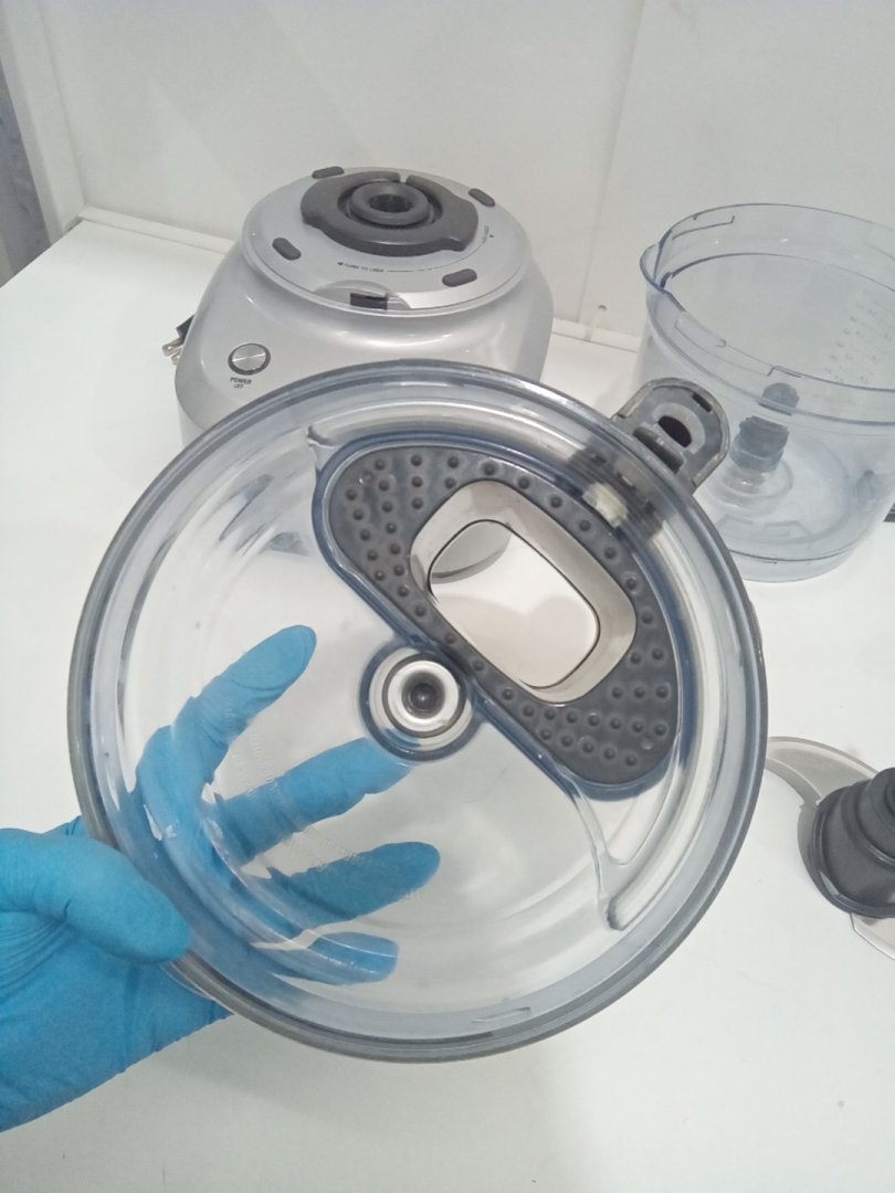 Item shows signs of heavy wear from frequent prior use in the bowl. Lid has traces of food residue, and has a crack being covered by the insert. Set is missing spatula and pusher. Please see photos.