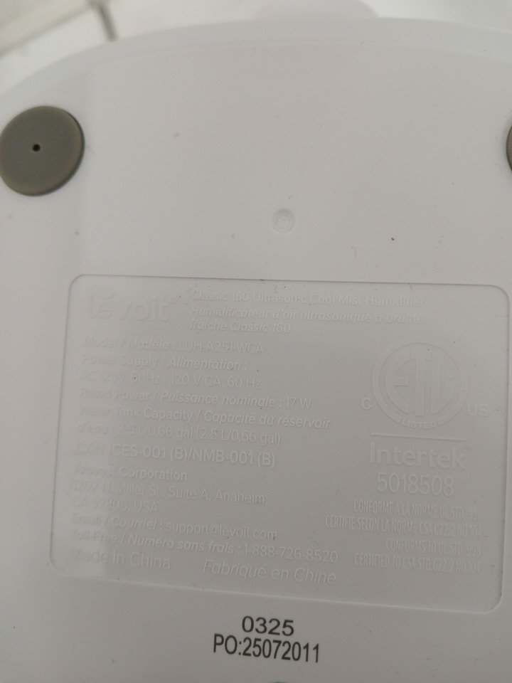 LEVOIT TOP FILL CLASSIC 160 ULTRASONIC COOL MIST HUMIDIFIER WITH AUTO SHUT OFF AND KNOB CONTROLS - 2.5L CAPACITY - WHITE - (MODEL: LUH-A251-WCA)