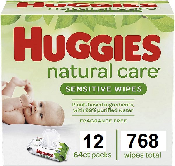 12PK HUGGIES NATURAL CARE SENSITIVE SKIN BABY WIPES - FRAGRANCE FREE, ALOE VERA - 64CT PER PACK (768 TOTAL WIPES) - WHITE/GREEN