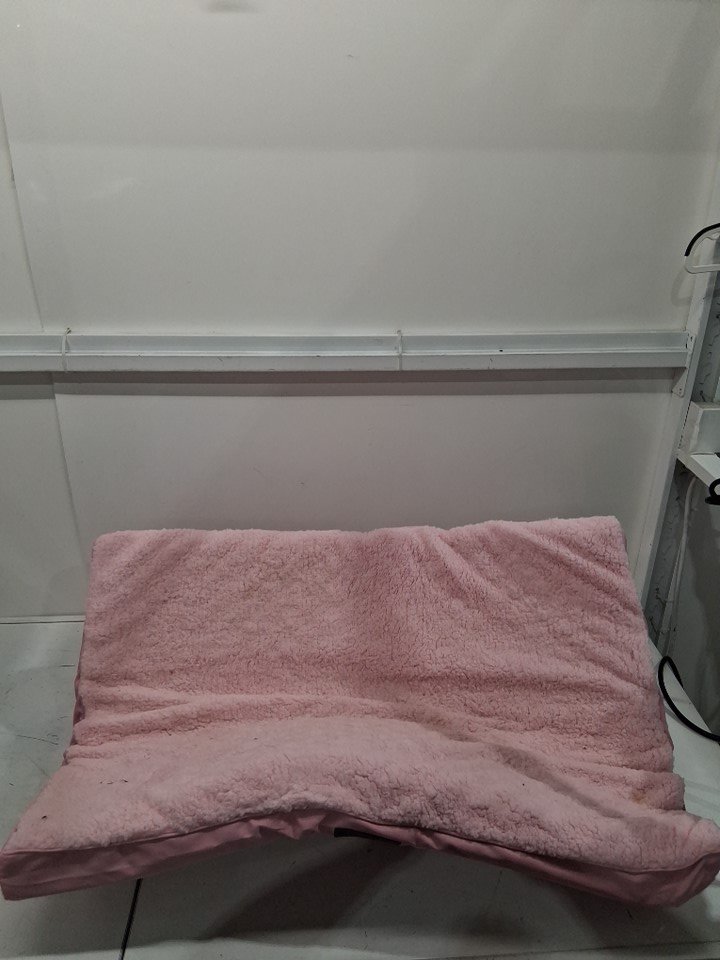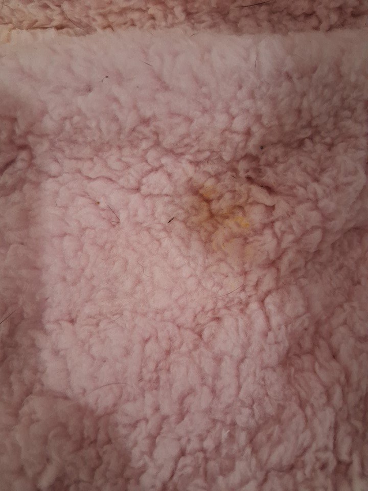 Product has multiple surface stains on top and bottom of products surface area also has hair and grass that is present on the product.