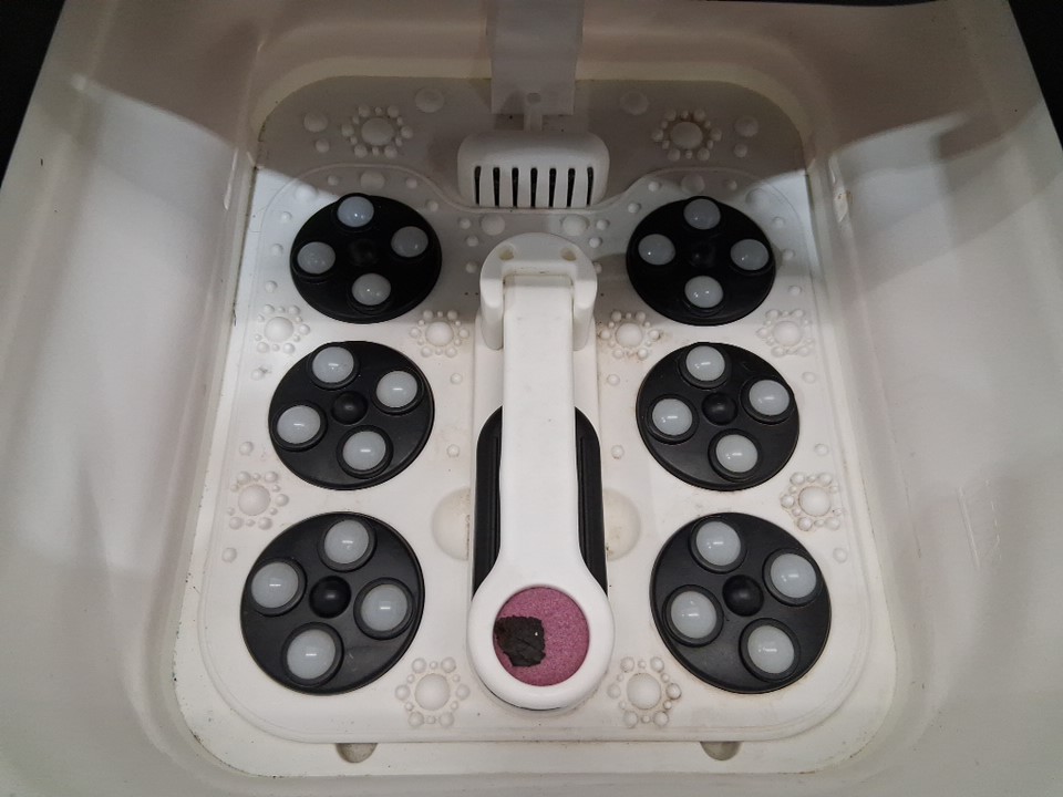 tested for power, there is dirt at the bottom of the tub and on the outside of the unit, indicating previous use