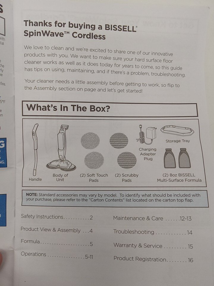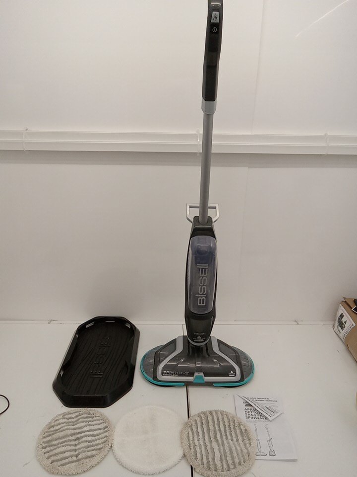 Item shows signs of being previously used prior to being returned. Item tested and working. Item marked with having issue, as there is a part on the main body of the item near the plastic handle that is cracked/split. Item is also missing one of the pads, the ac charging adapter and the bissell multi-surface formula solution (this is missing because of being previously used).