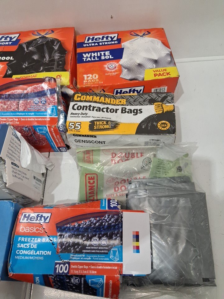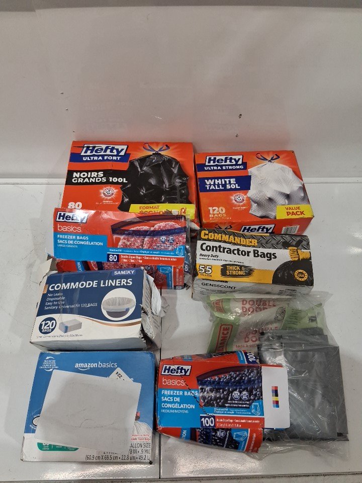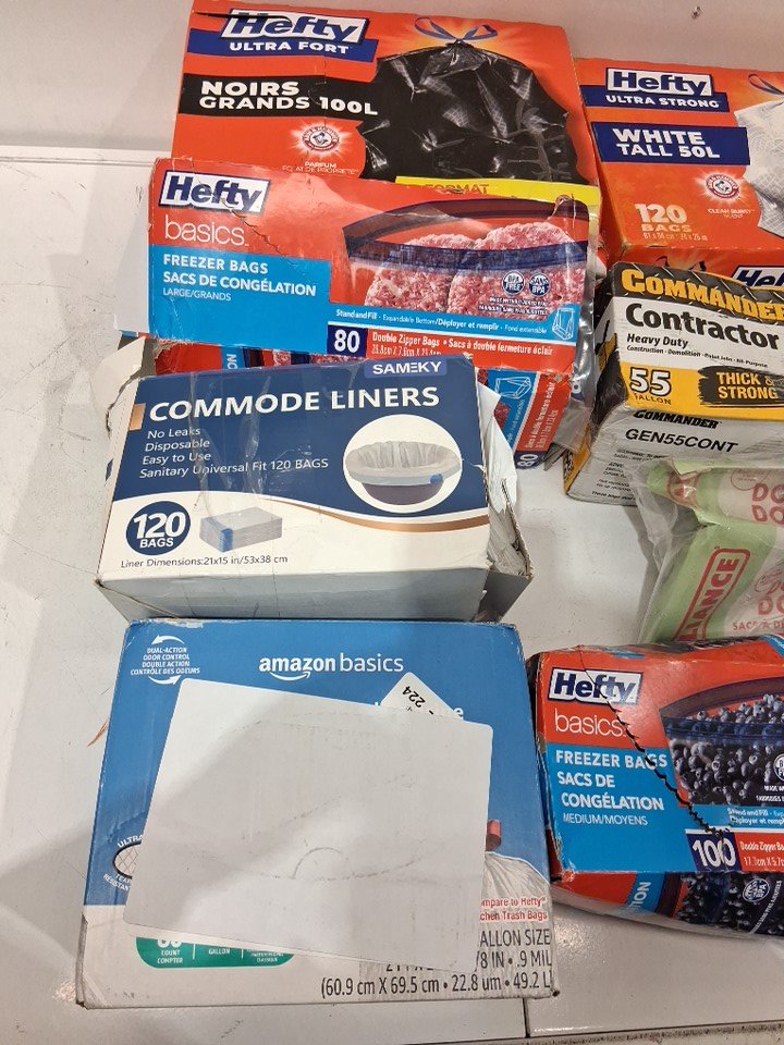 7+ *ASSORTED* trash garbage BAGS COMMODE LINERS FREEZER BAGS - HEFTY / AMAZON BASICS / COMMANDER - various sizes, scents and colours