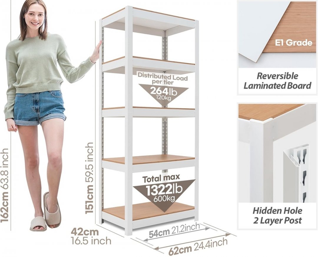Homedant House Heavy Duty Adjustable 5-tier Laminated metal shelving storage solution Utility Rack shelf Unit - 16.5" x 24.4" x 59.5" - White (Model: HS SMALL/08 HS604025-5)