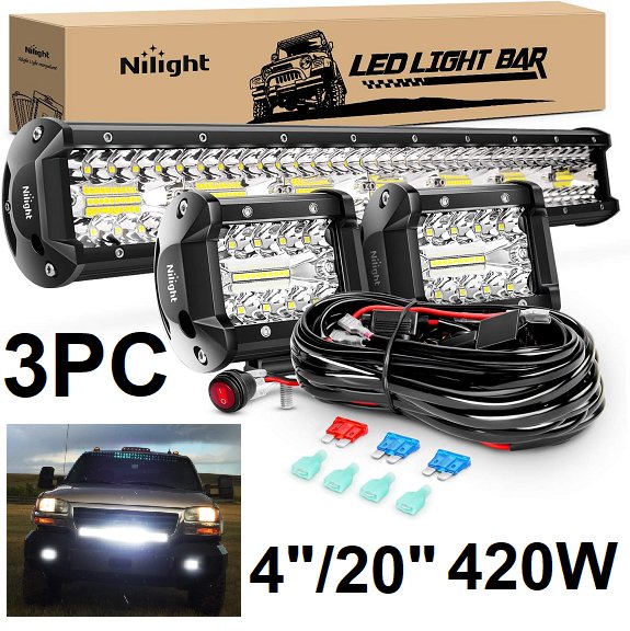 NILIGHT Triple Row Spot Flood Combo Led Light Bar with Off-Road Wiring Harness - 4"/20" - 420W - BLACK - (MODEL:ZH412)