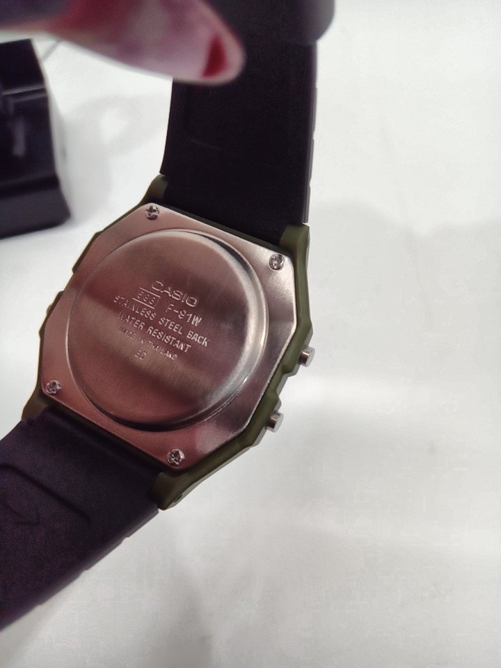 MEN'S CASIO VINTAGE CASUAL WATCH WITH RESIN STRAP - 35.5MM - BLACK/GREEN (MODEL:F-91WM-3ACF)