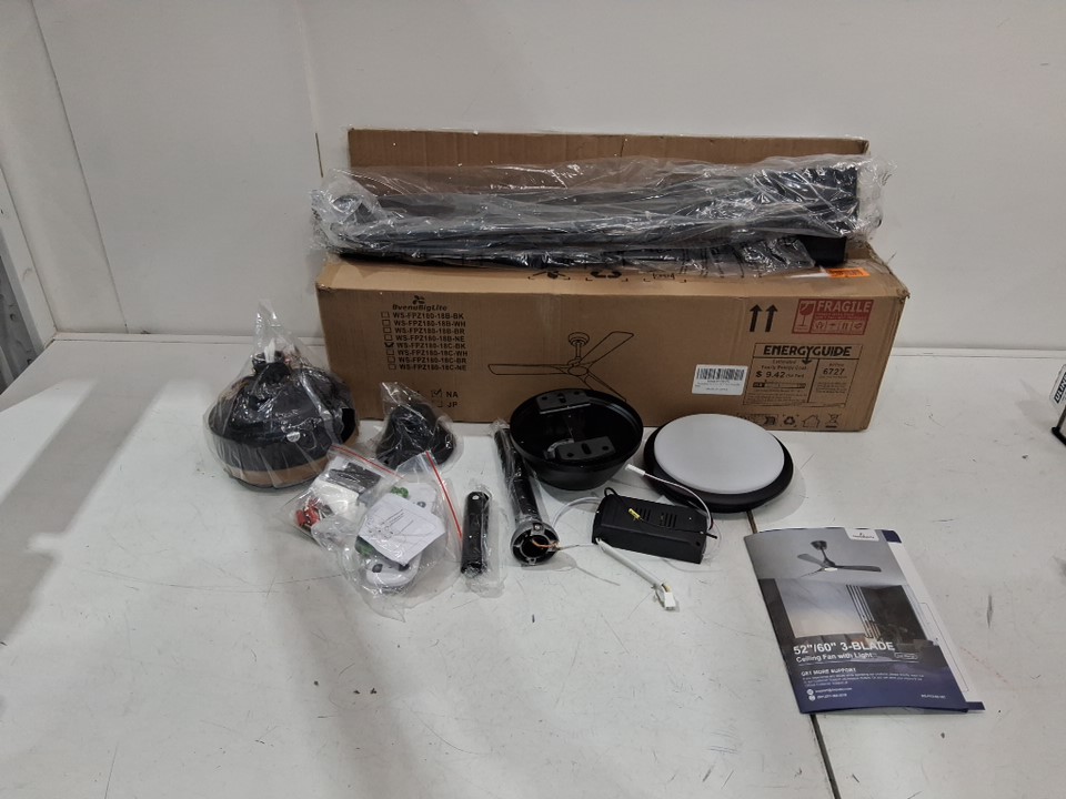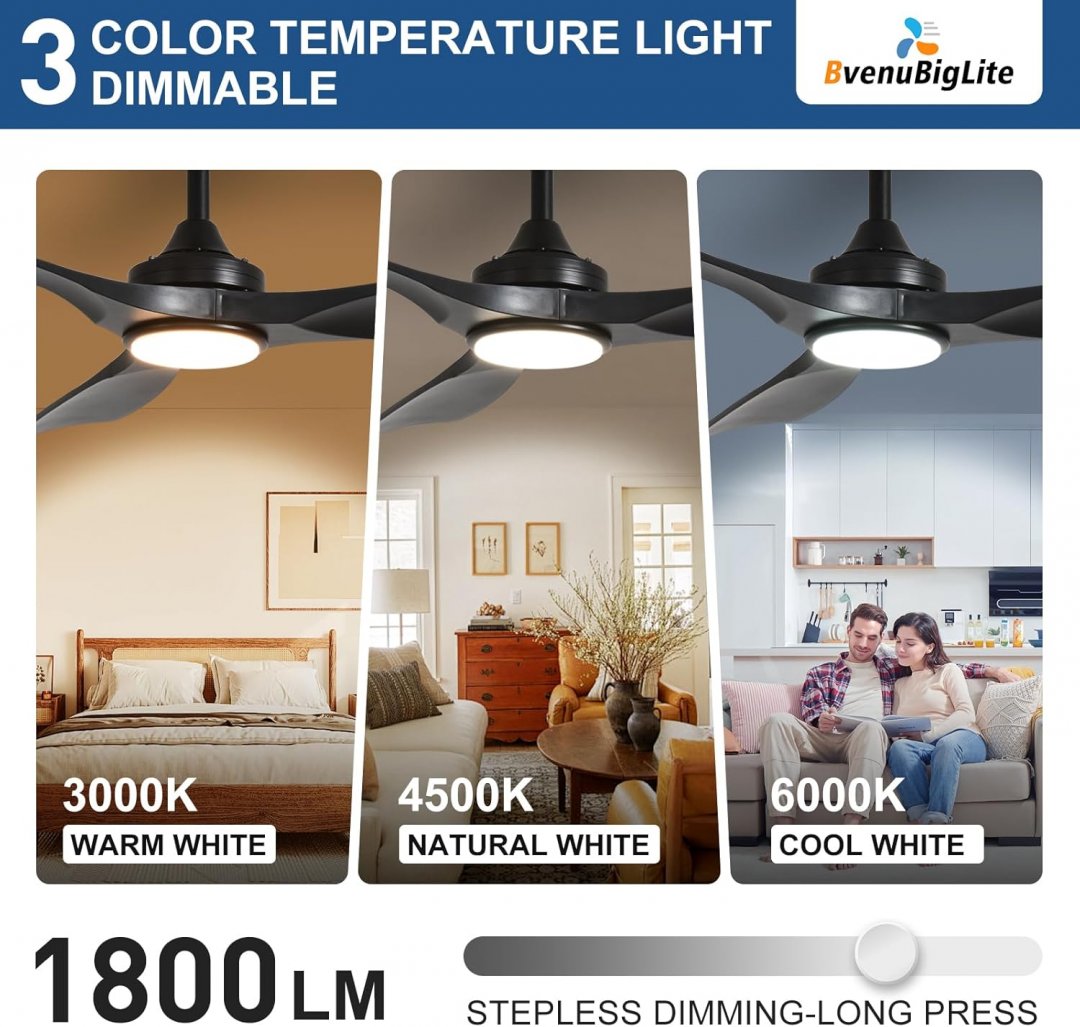 bvenubiglite indoor outdoor ceiling fan with led light 3 blade for patios remote control and app ultra quiet - 52" - 3000k - 4500k - 6000k - black (Model: ws-fpz180-18c-bk)
