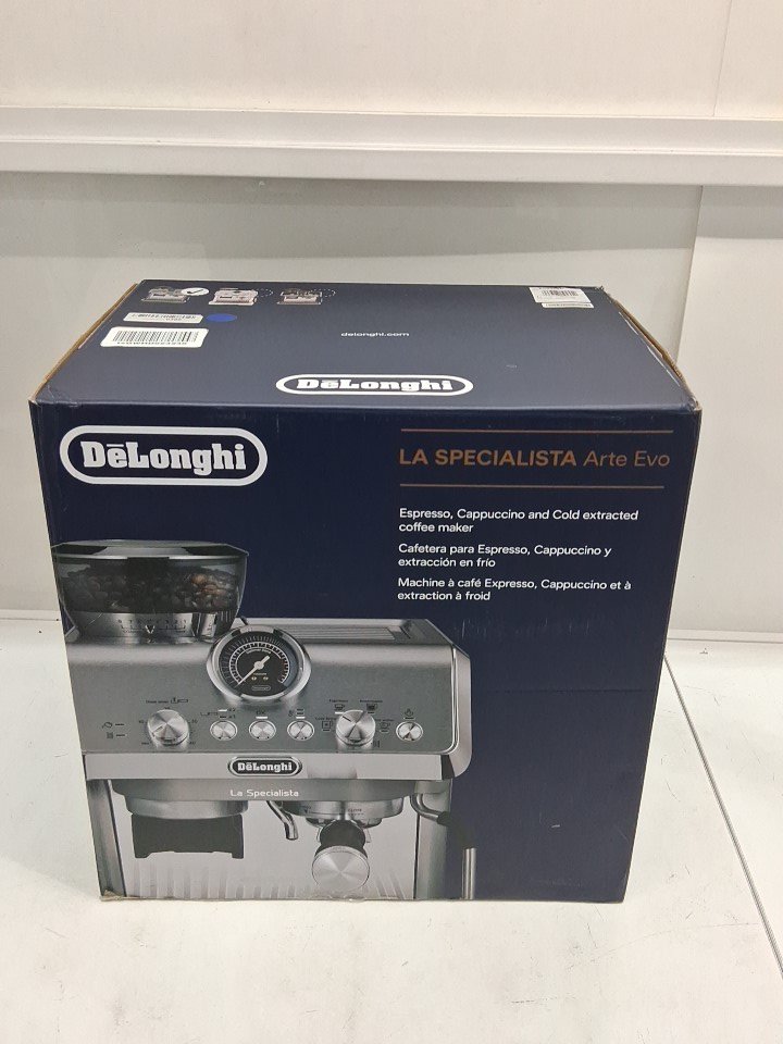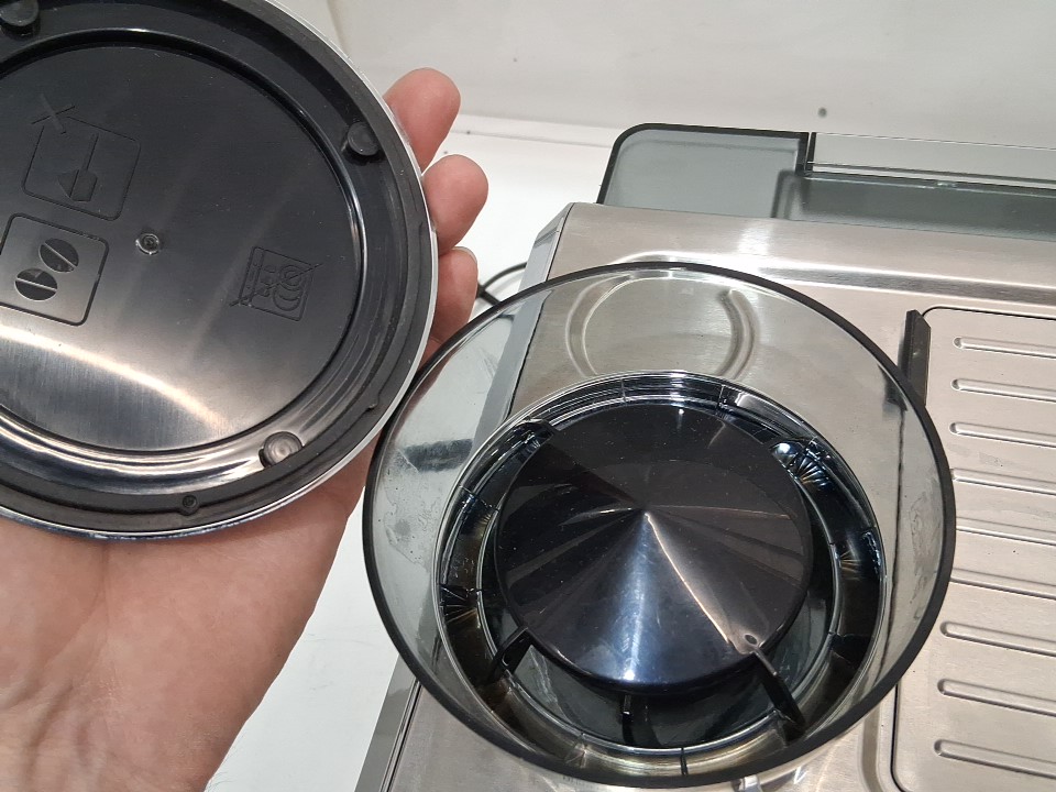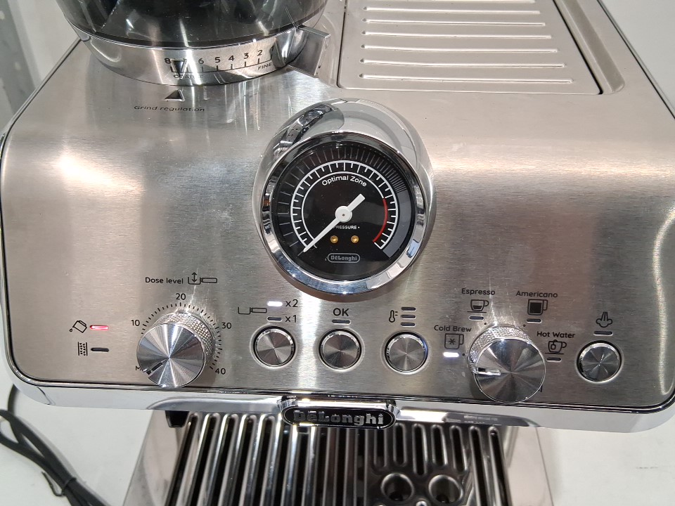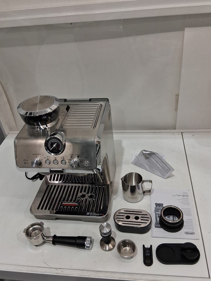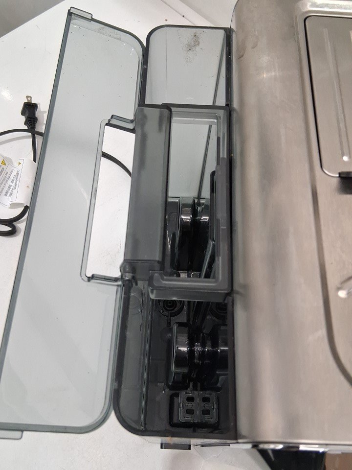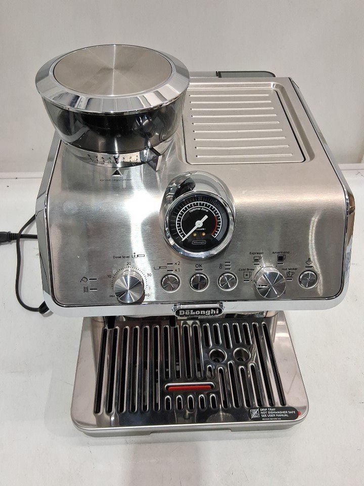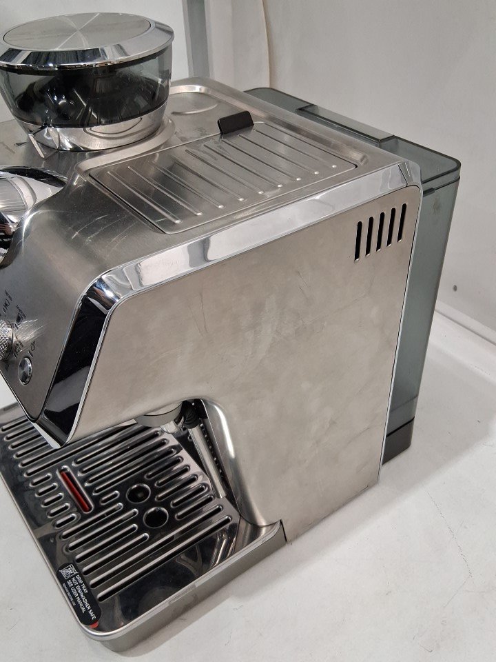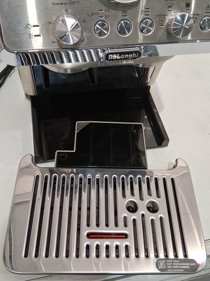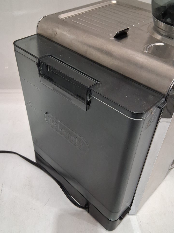 Item has minor residue markings on the small cup grille and drip tray, light coffee stains in crevices under the drip tray, minor markings along the exterior; does not include a cleaning brush, descaling solution, or water hardness test strip from previous gentle use, see photos.