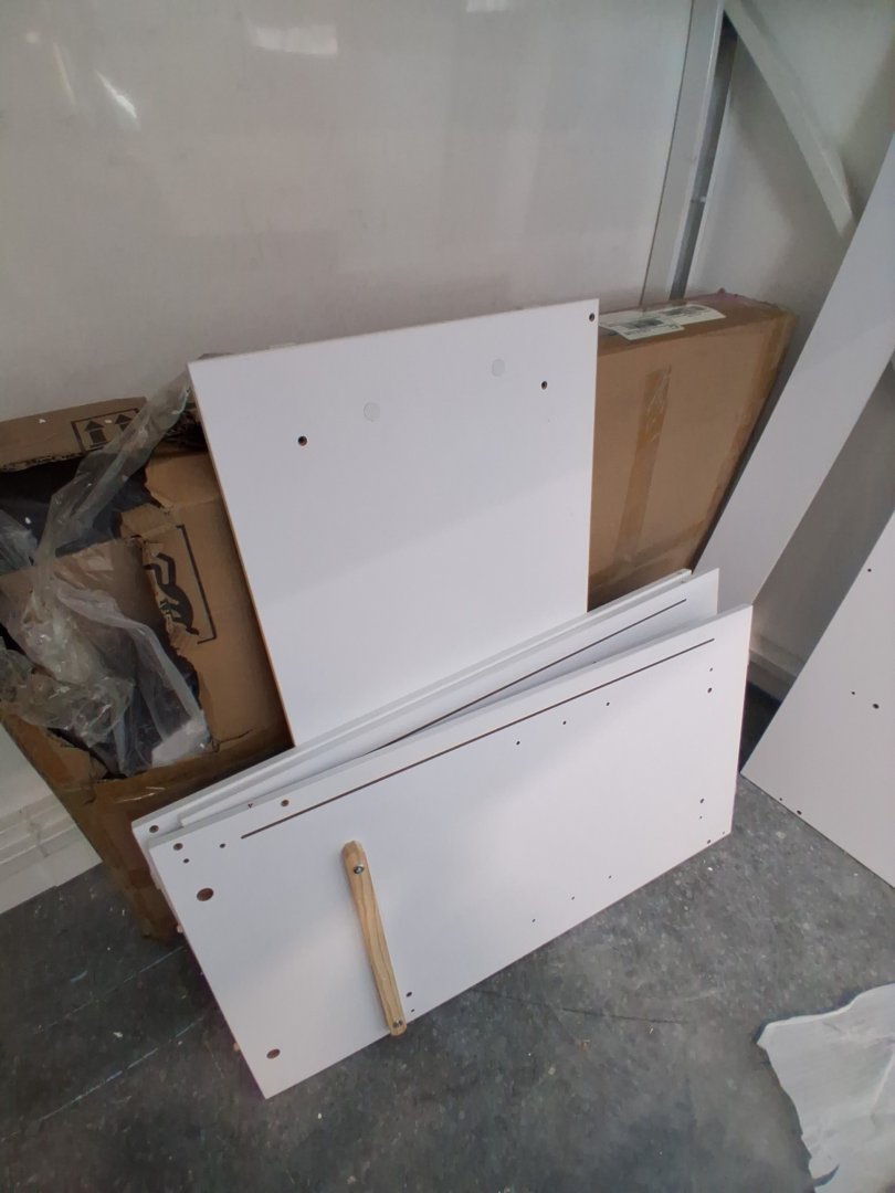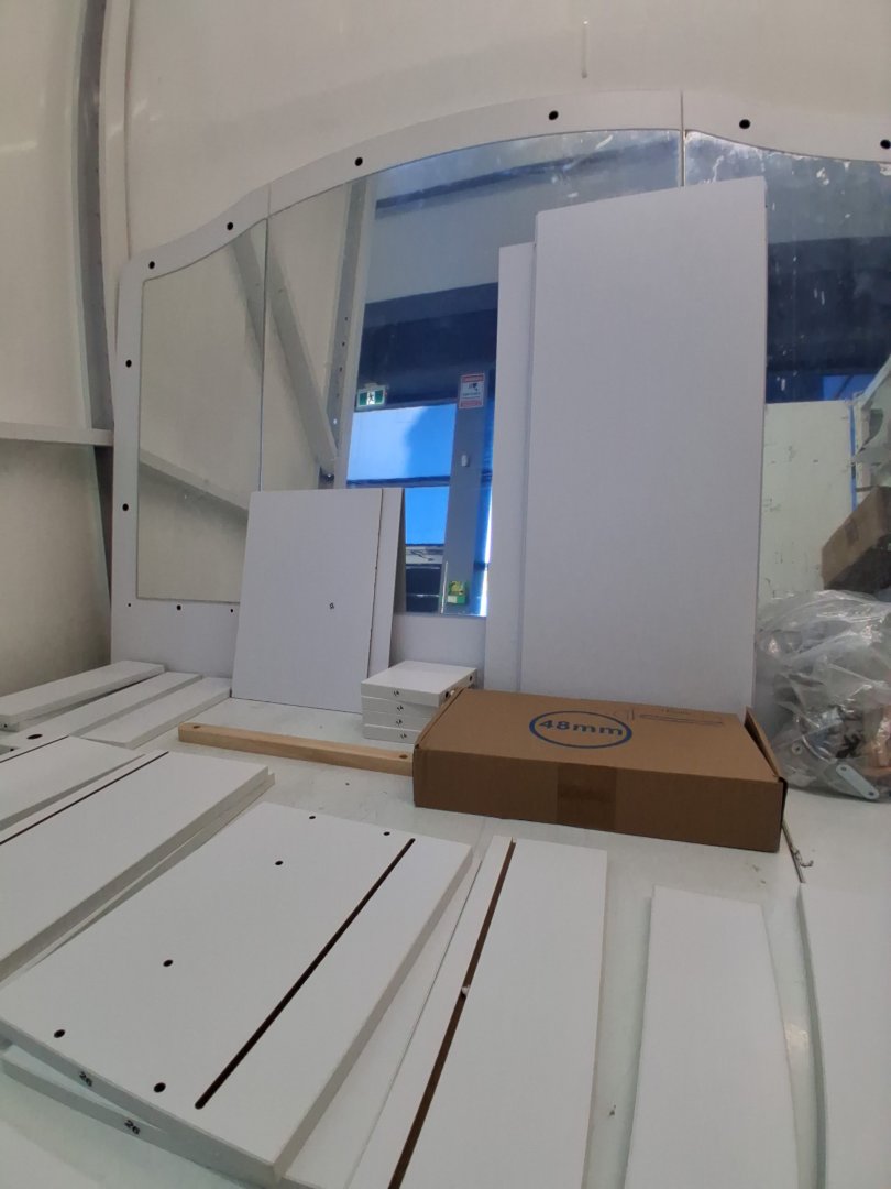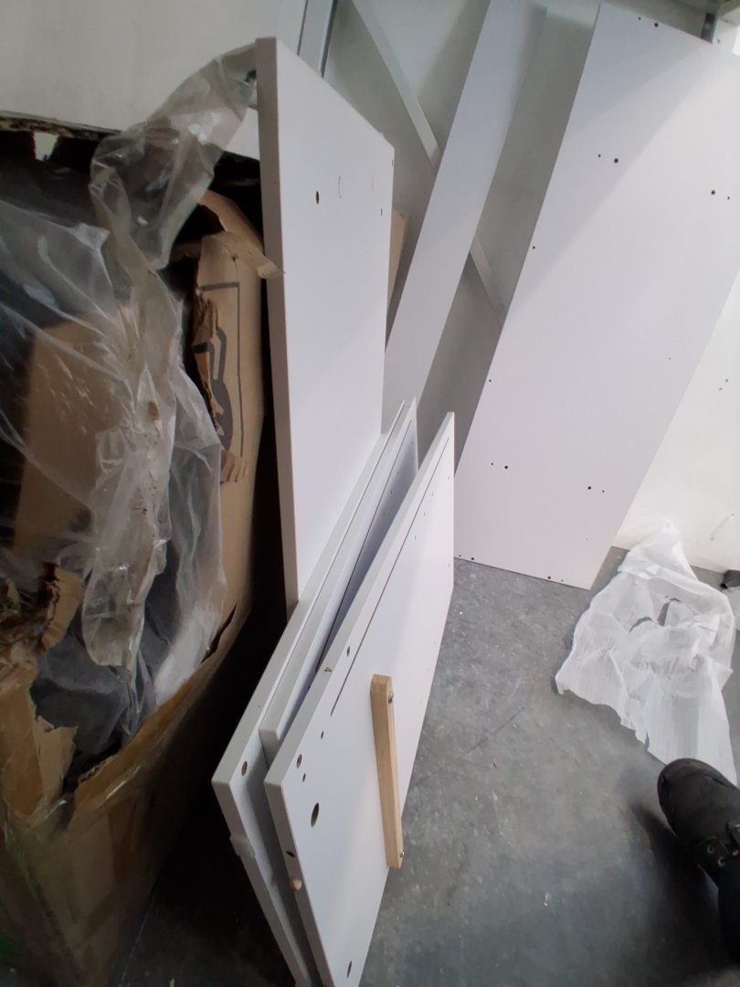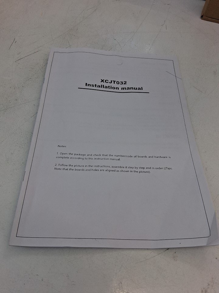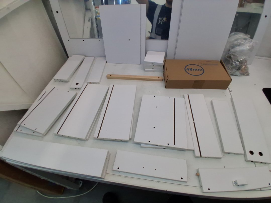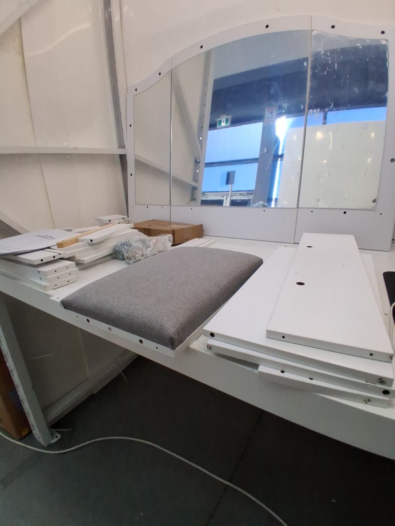 Mirror has been briefly inspected and doesn't seem to have any visible scratches behind distressed plastic cover. Missing piece 1 of 2 on piece #8 which is a bottom cover to the vanity. Some hardware like wooden dowels and screws have been attached to pieces, but highly unlikely this set was assembled due to mirror cover still being intact, and hardware bags that are still unopened. Slight wear to some pieces, likely due to poor repackaging. may need hardware.