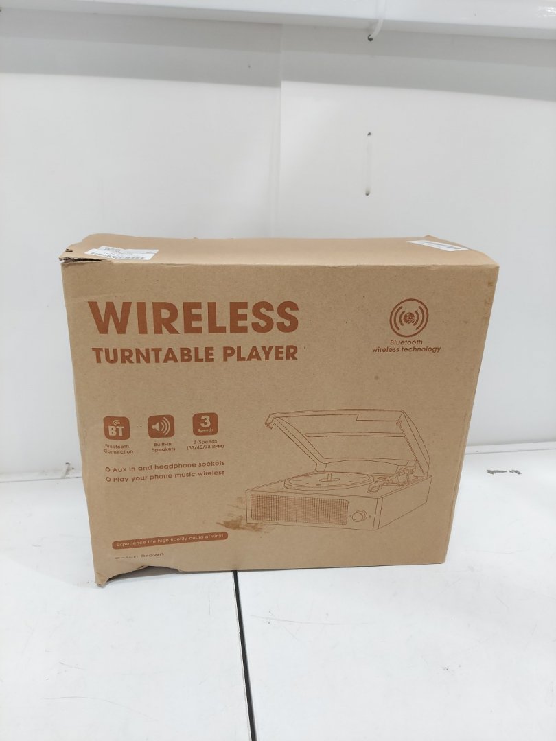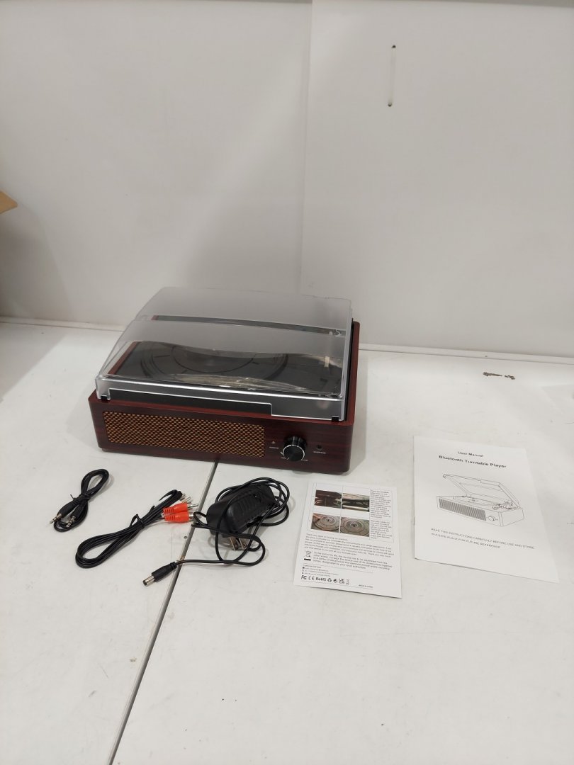 RECORD PLAYER BLUETOOTH BELT-DRIVEN 3-SPEED TURNTABLE - BUILT-IN STEREO SPEAKERS WITH HEADPHONE JACK/AUX INPUT/RCA LINE OUT - RED-WOOD (MODEL: M49A)