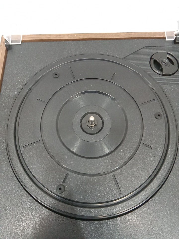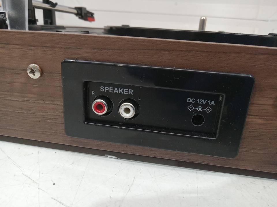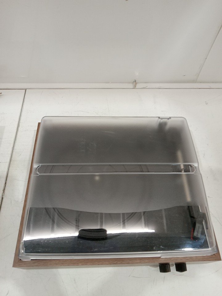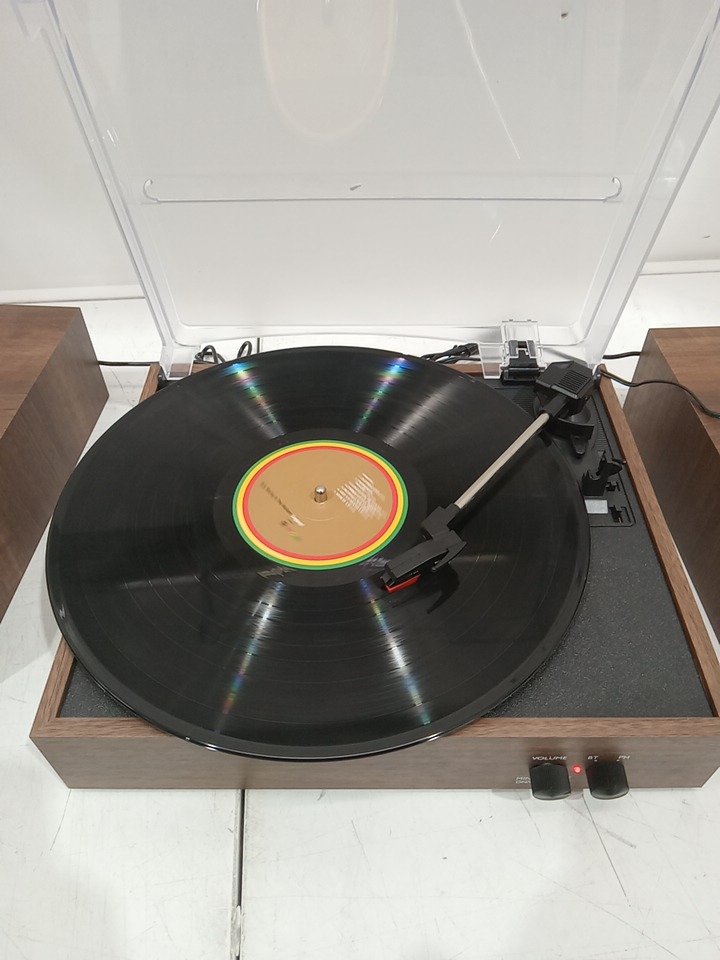 The manual are missing from the original packaging. There are scratch marks on the top of the turntable and on the sides from previous use. Tested for power and functionality. (Please see photos)