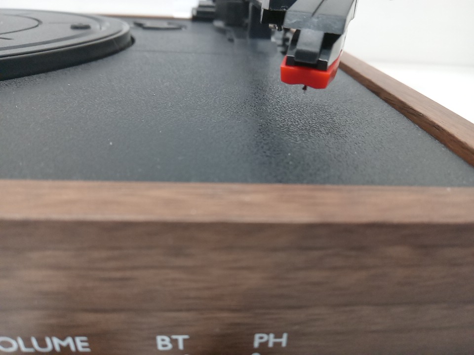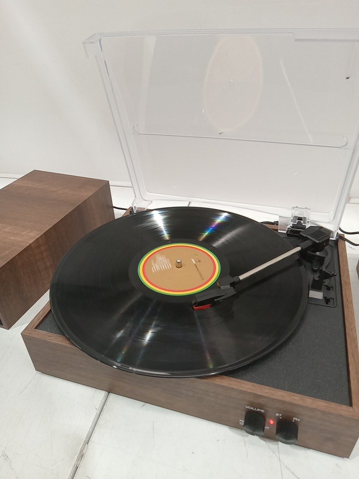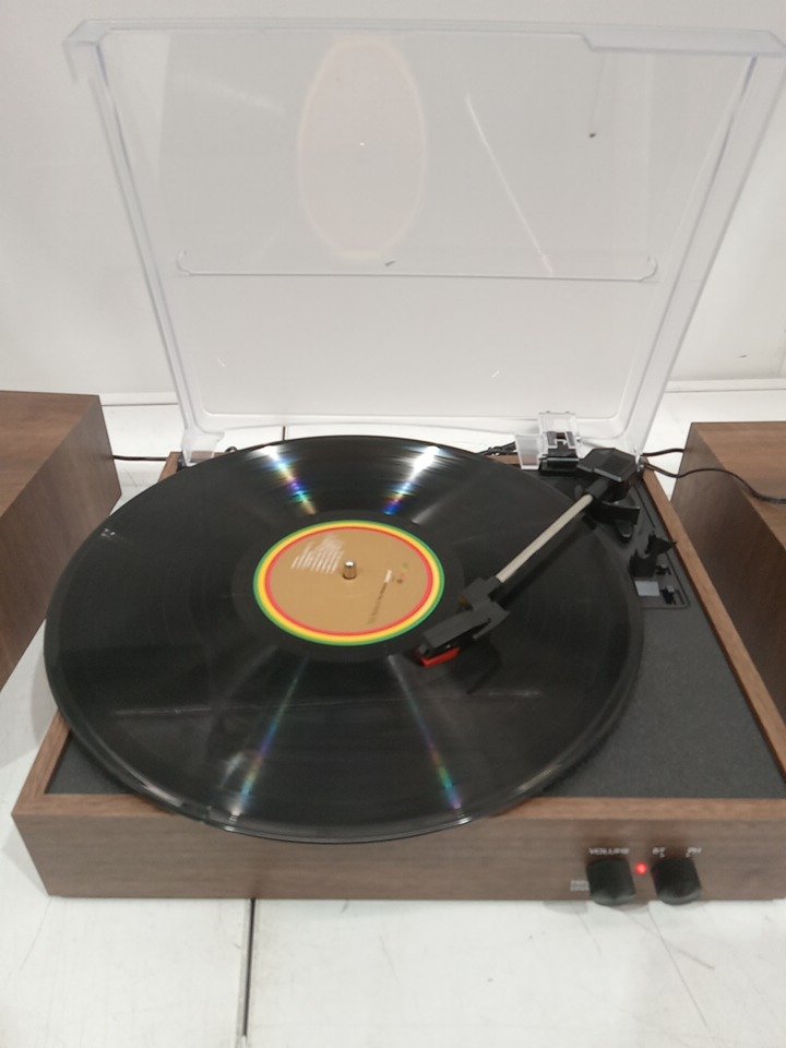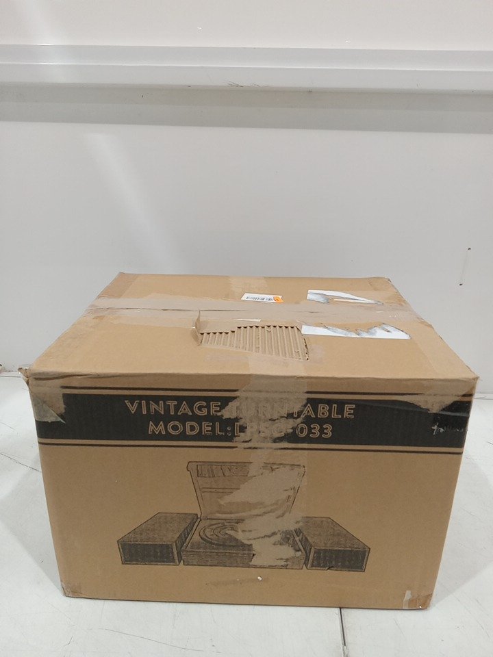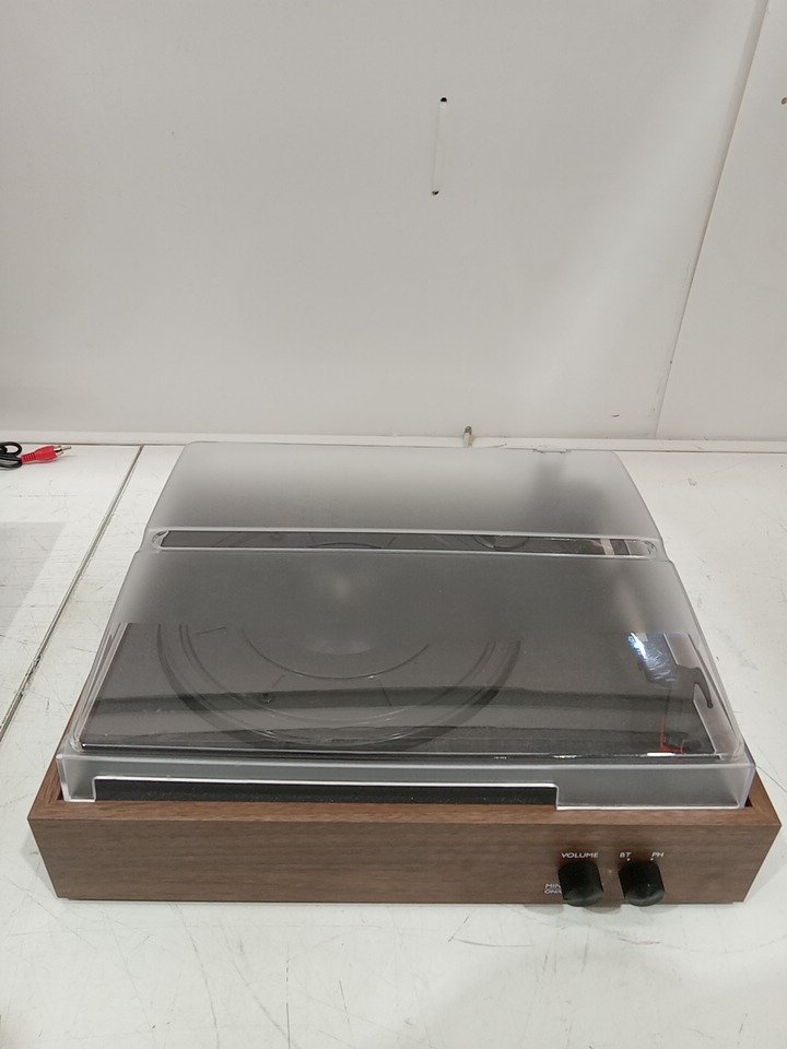 The manual are missing from the original packaging. There are scratch marks on the top of the turntable and on the sides from previous use. Tested for power and functionality. (Please see photos)