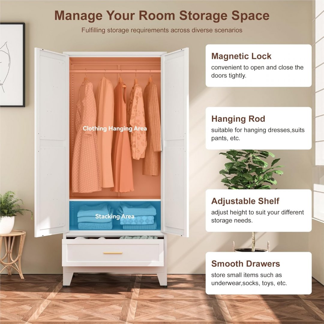 Wardrobe Closet Armoire with 2 Doors, Large Storage Drawer, Hanging Rod, and Adjustable Shelves and Heavy-Duty Steel Frame and Smooth Handles - 71" - White (Model: mz02wh01)