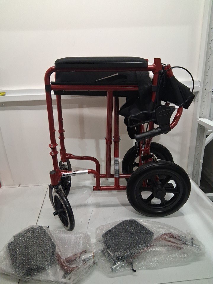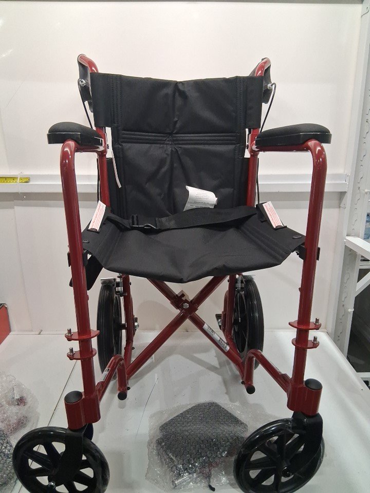 MEDLINE BASIC ALUMINUM TRANSPORT WHEELCHAIR - 19" - 12" REAR WHEELS WITH BRAKES - 300lbs capacity - RED (MODEL: MDS808210ARE)