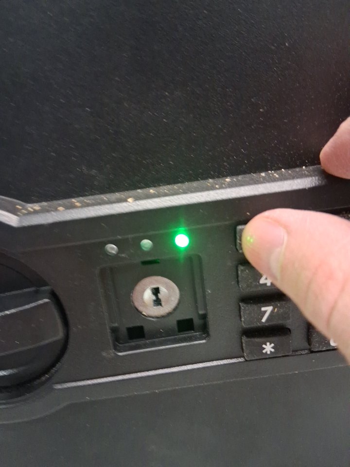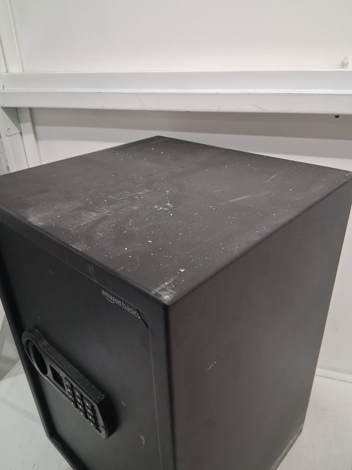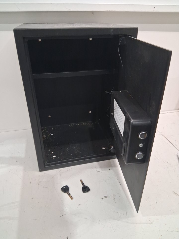 Tested for power with the keypad and locking. Unlocking with the code was not tested by the two keys were tested for opening. Please note: • The safe had been previously installed and there are scrapes/scratches around the exterior as well as sawdust inside, see photos. • The plastic flap which covers the keyhole is missing, see photos. • The screws/hardware for mounting the safe on a wall are missing.
