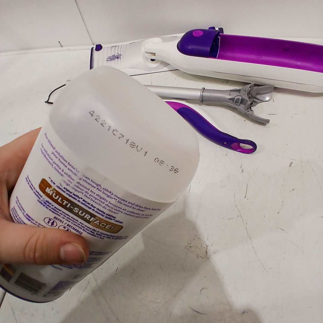 some of the cleaner is missing from the cannister, and there is cleaning product residue around where the cannister goes we do not have any of the mop pads