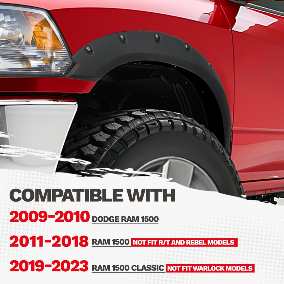 4pc ECOTRIC Fender Flares - Compatible with 2009-2010 Dodge Ram 1500/2011-2018 Ram 1500/2019-2023 Ram 1500 Classic Fleetside - Textured Black Rivet (MODEL: ‎VC-LYAP-247)