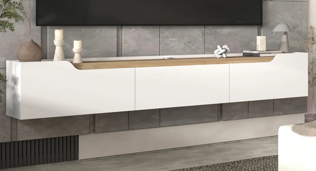 ebern designs eva modern floating tv stand - 70.8" x 12.3" x 31.4" - white/oak wood