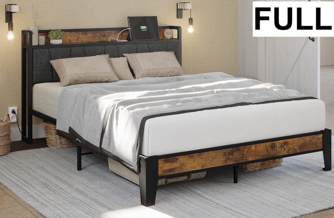 LIKIMIO BED WITH Storage Headboard AND Charging Station No Box Spring Needed - FULL - VINTAGE BROWN(MODEL: HK-FBF-008)