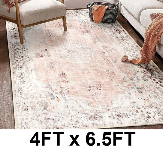 MUJOO Machine Washable Non-Slip Boho Area Rug - 4FT x 6.5FT - Pink Floral/PINK/WHITE/BROWN