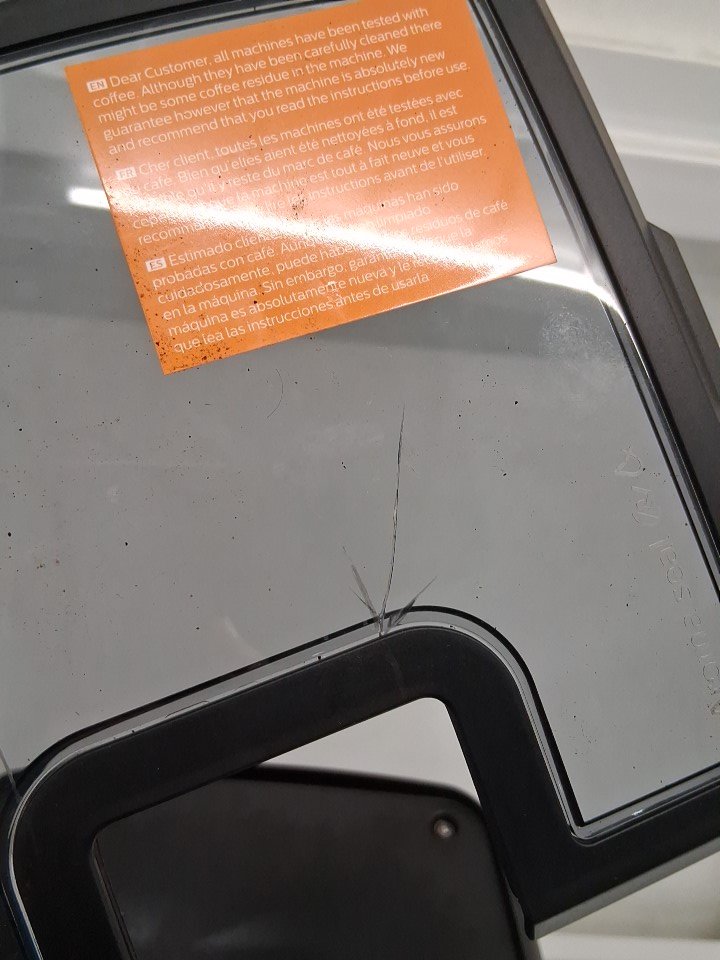 This item will not be eligible for our warranty unless the machine was descaled & cleaned using the manufacturer's instructions. If you require additional time for our warranty in order to clean these machines, please reach out to us before your specified warranty deadline. **Due to the high sensitivity and frequent upkeep of operation on these units, additional cleaning may be required. If not descaled with model specific cleaning product, the units may become clogged and will cause potential operational issues. Please refer to the manufacturer's operations manual for detailed cleaning instructions.** **Tested for power.** Item has coffee grounds debris throughout machine, residue markings around the drip tray and spout, minor scuffs/markings along the exterior, does not include a water hardness test strip from previous gentle use, see photos. Item has a minor crack in the hopper lid and the flap for the pre-ground coffee compartment has a broken nub and doesn't sit properly in place, see photos. *GENERIC CONDITION STATEMENT* This item has been handled/inspected, tested if needed by our listing staff to the best of their ability/knowledge and for an unknown reason arrived to our facility with an issue. This issue can either be a very minor/major cosmetic issue which most likely occurred during shipping such as a dent, indent, scuff, stain, scratch or nick. If not a cosmetic issue, it can be a function issue with the item itself or there could be certain parts missing to make the item complete from how it is sold originally. (See lister notes and photos attached of the issue stated as well as packaging condition).