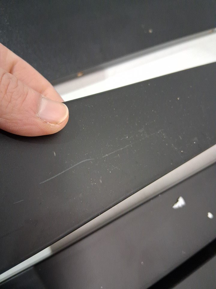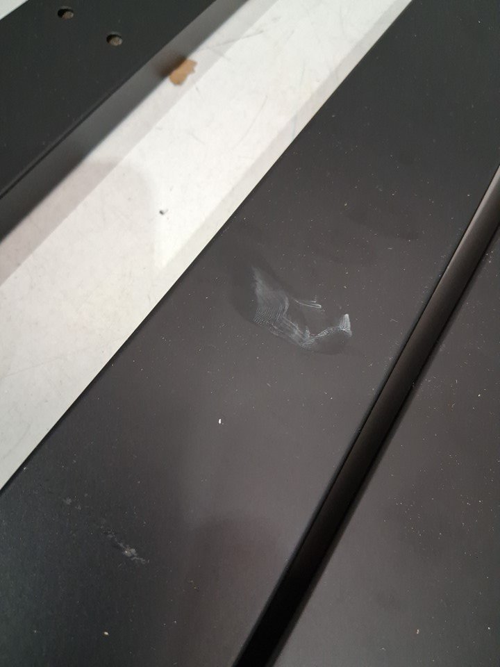 scuff and scratch marks around entire item and a small wood chip on the desk top indicating prior use item was tested for basic power only