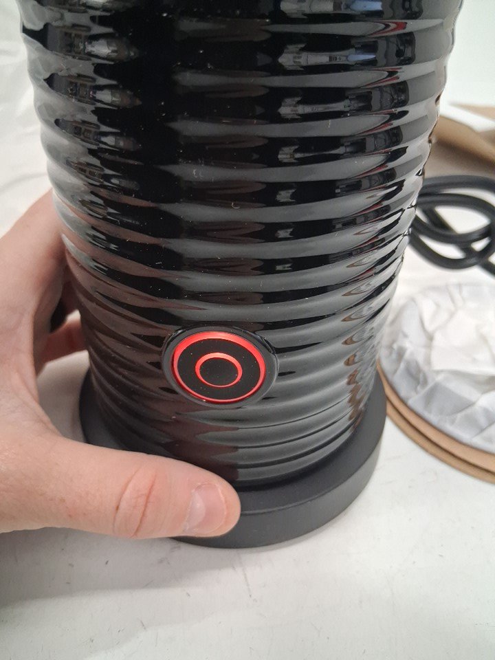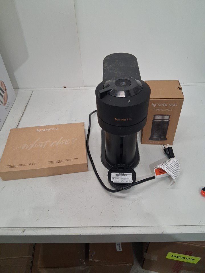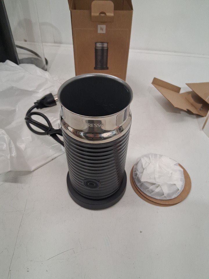 Coffee machine is brand new, has been opened, is covered in cardboard dust, Nespresso pods are still sealed, and frother is brand new. Tested for power