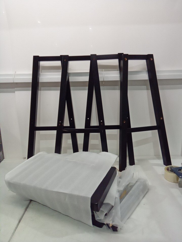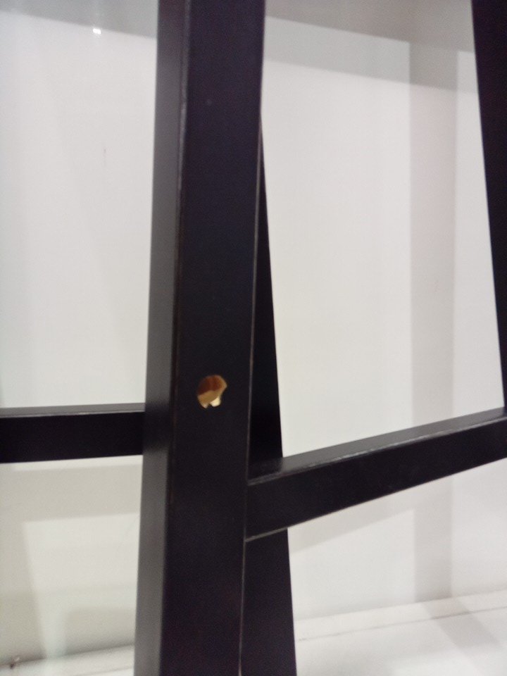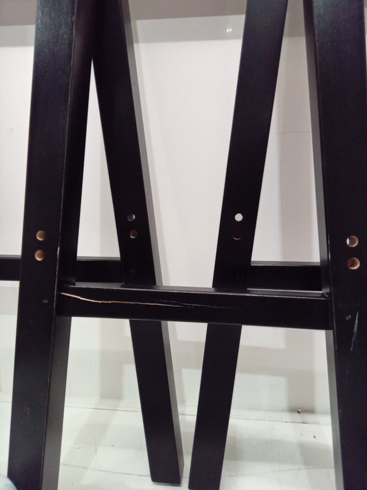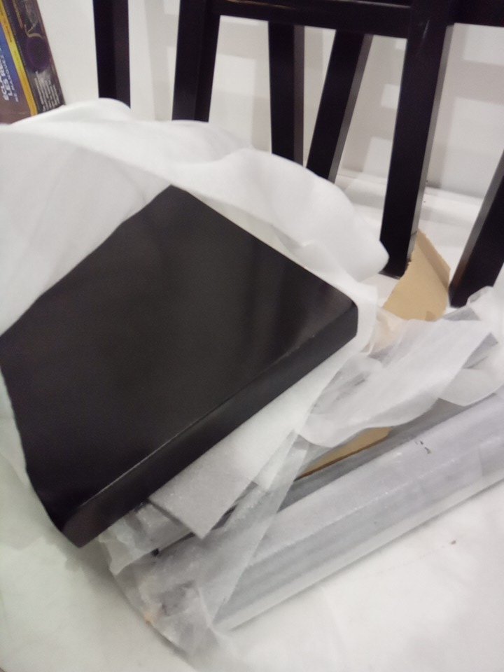 there is cracking in the wood on the legs and hardware may be missing indicating previous assembly. see photos.