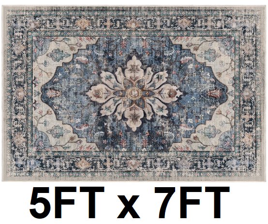 washable vintage boho style area rug - 5ft x 7ft - blue/cream