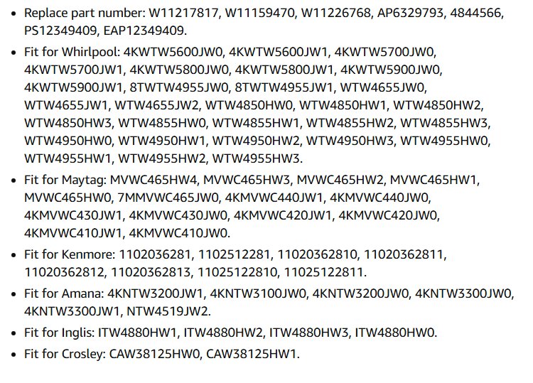 some oil residue on the parts indicating prior use Replace part number: W11217817, W11159470, W11226768, AP6329793, 4844566, PS12349409, EAP12349409. Fit for Whirlpool: 4KWTW5600JW0, 4KWTW5600JW1, 4KWTW5700JW0, 4KWTW5700JW1, 4KWTW5800JW0, 4KWTW5800JW1, 4KWTW5900JW0, 4KWTW5900JW1, 8TWTW4955JW0, 8TWTW4955JW1, WTW4655JW0, WTW4655JW1, WTW4655JW2, WTW4850HW0, WTW4850HW1, WTW4850HW2, WTW4850HW3, WTW4855HW0, WTW4855HW1, WTW4855HW2, WTW4855HW3, WTW4950HW0, WTW4950HW1, WTW4950HW2, WTW4950HW3, WTW4955HW0, WTW4955HW1, WTW4955HW2, WTW4955HW3. Fit for Maytag: MVWC465HW4, MVWC465HW3, MVWC465HW2, MVWC465HW1, MVWC465HW0, 7MMVWC465JW0, 4KMVWC440JW1, 4KMVWC440JW0, 4KMVWC430JW1, 4KMVWC430JW0, 4KMVWC420JW1, 4KMVWC420JW0, 4KMVWC410JW1, 4KMVWC410JW0. Fit for Kenmore: 1102036281, 1102512281, 11020362810, 11020362811, 11020362812, 11020362813, 11025122810, 11025122811. Fit for Amana: 4KNTW3200JW1, 4KNTW3100JW0, 4KNTW3200JW0, 4KNTW3300JW0, 4KNTW3300JW1, NTW4519JW2. Fit for Inglis: ITW4880HW1, ITW4880HW2, ITW4880HW3, ITW4880HW0. Fit for Crosley: CAW38125HW0, CAW38125HW1.