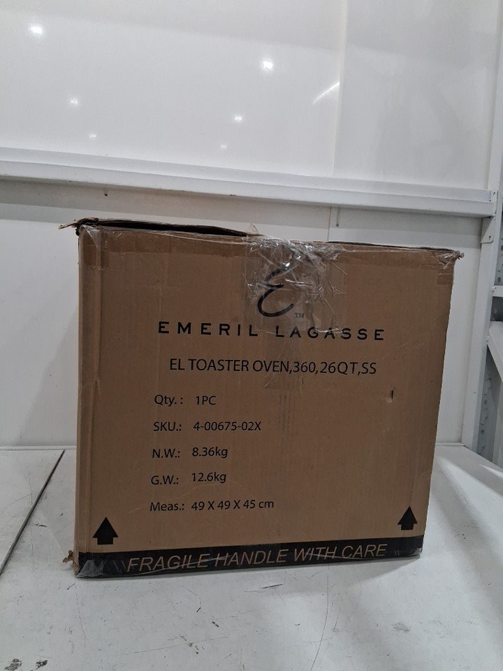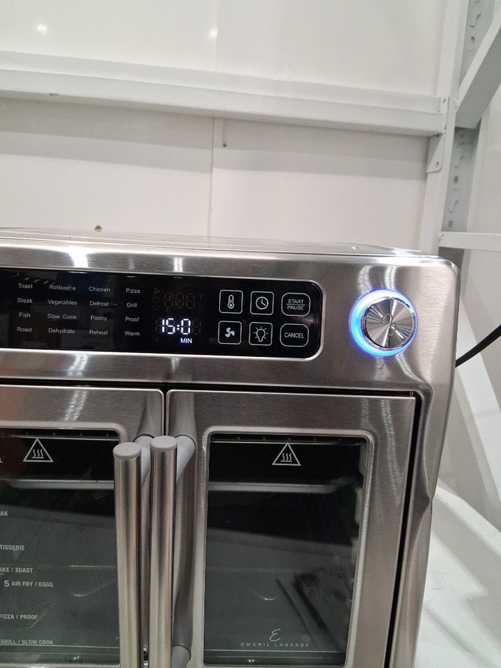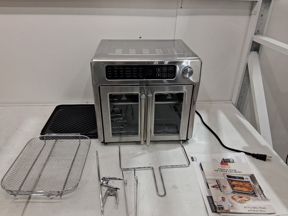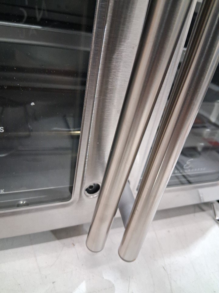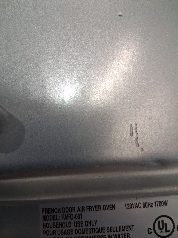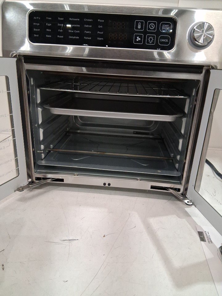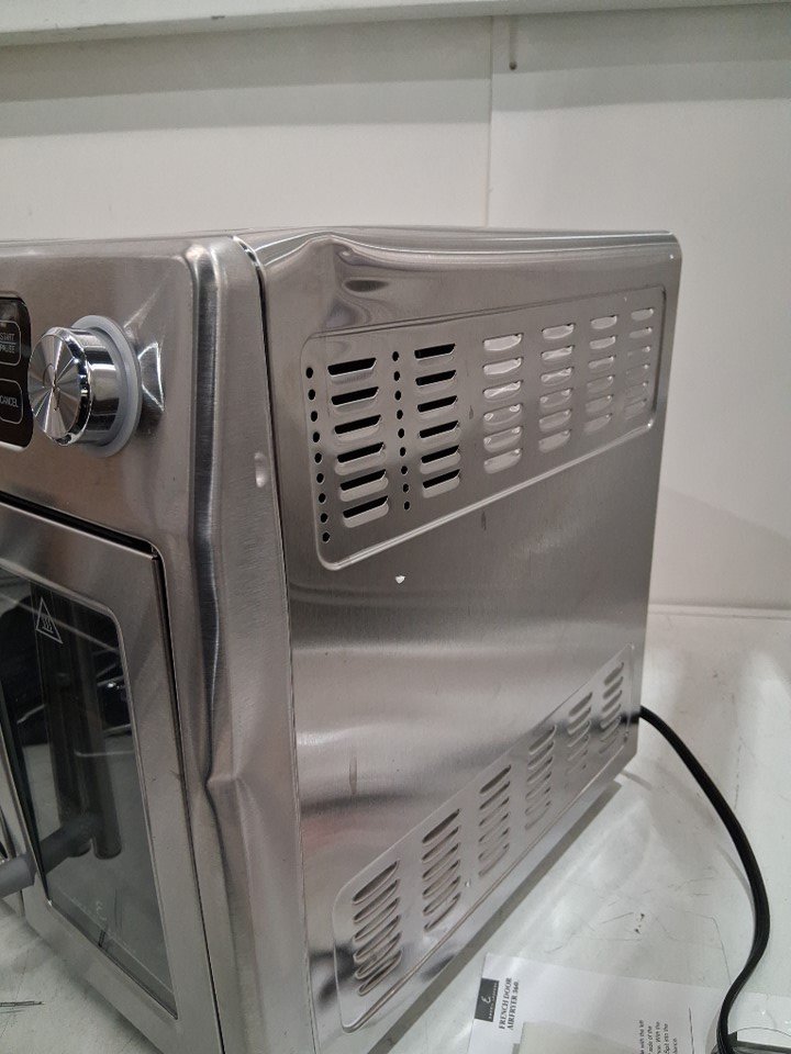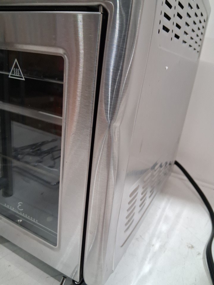 The item has two visible dents on the right side of the toaster oven, and one of the handles is missing a part. However, the toaster oven door can still easily open and close. It has been tested for power. See photos for details.