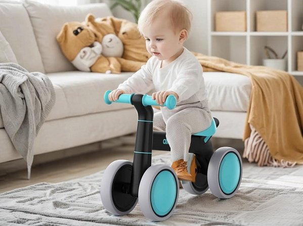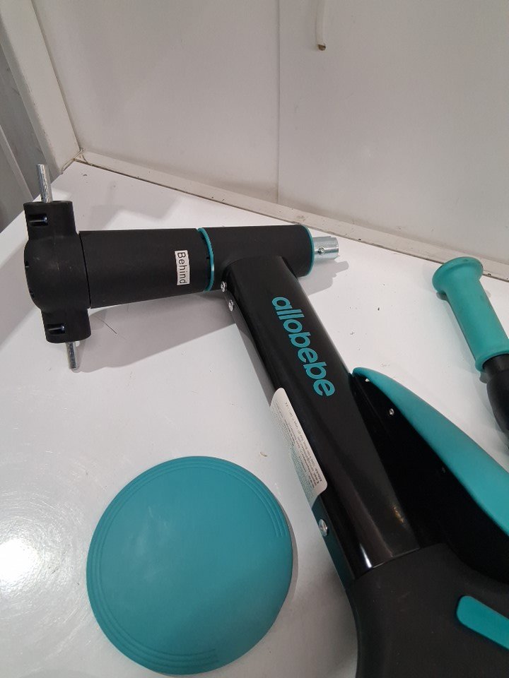 There is some dirt and dust on the wheels and part of the bike is assembled.