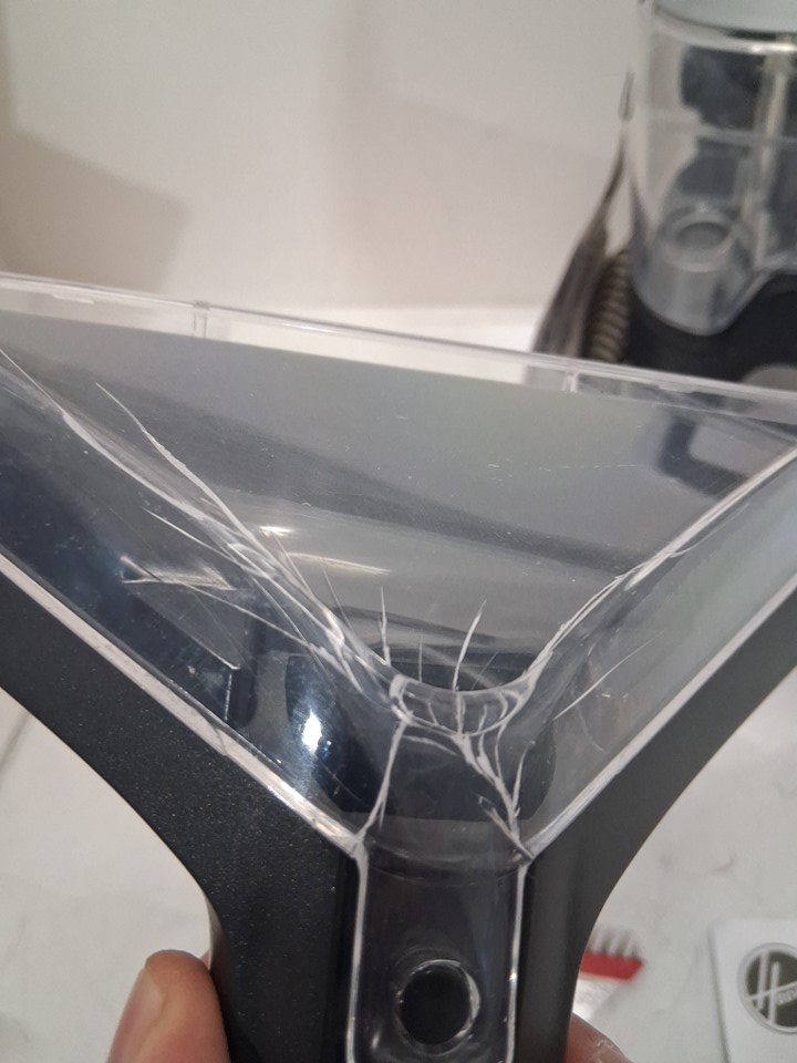 Back cover on the main brush is cracked- unsure if this will leak when used. Scratches on front of unit from shipping distress (See photos)
