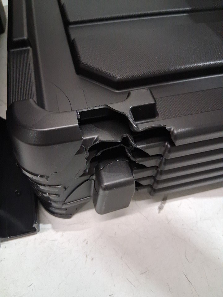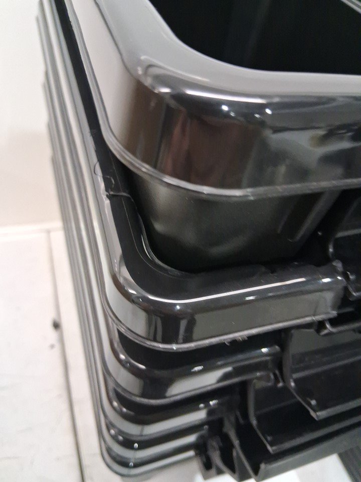 6/6 lids are cracked in the same spot also a top lid is cracked in another spot and one or two bins is also cracked I did put a lid on the bins to see if they still lock with some success however there will be a inch or two sized hole exposed when locking in the lids.