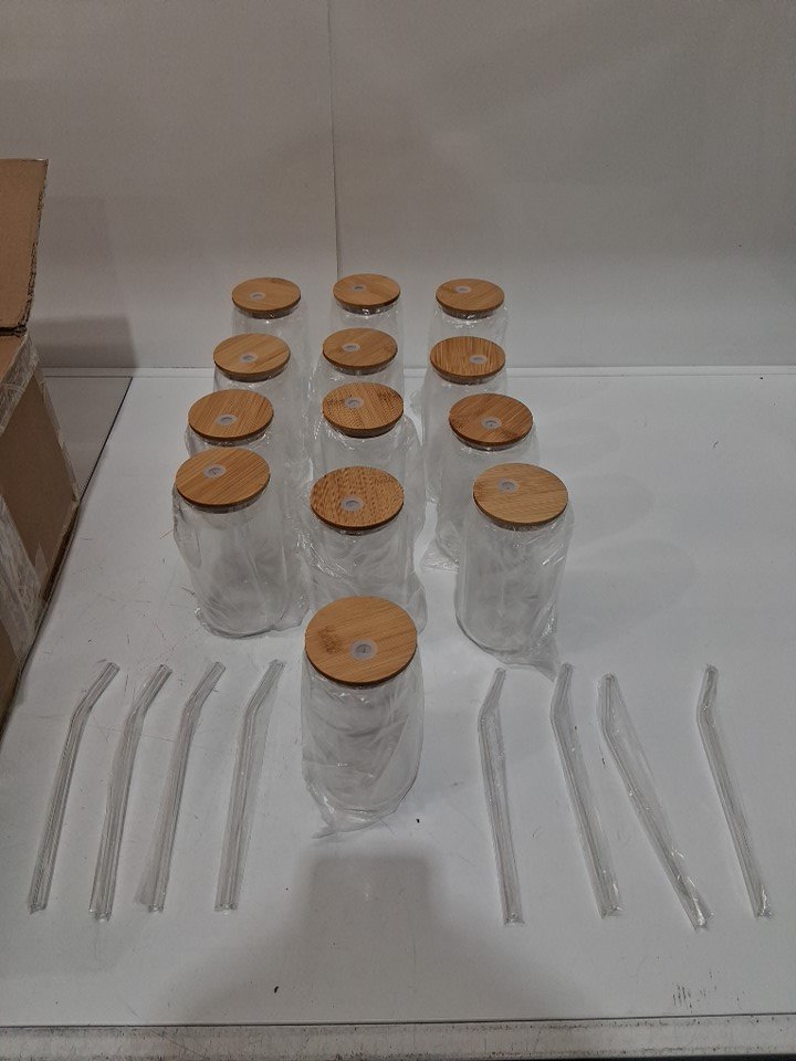 22PC glass cups with bamboo lids and straws - 16oz - (13) cups, (9) straws - clear