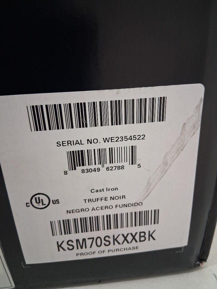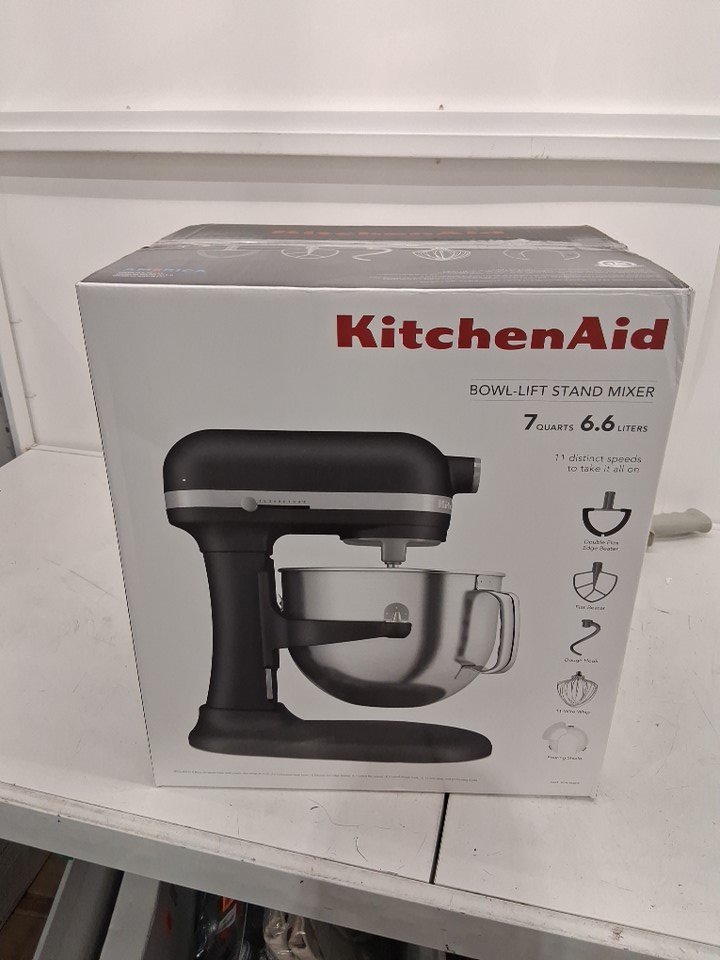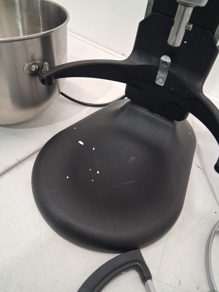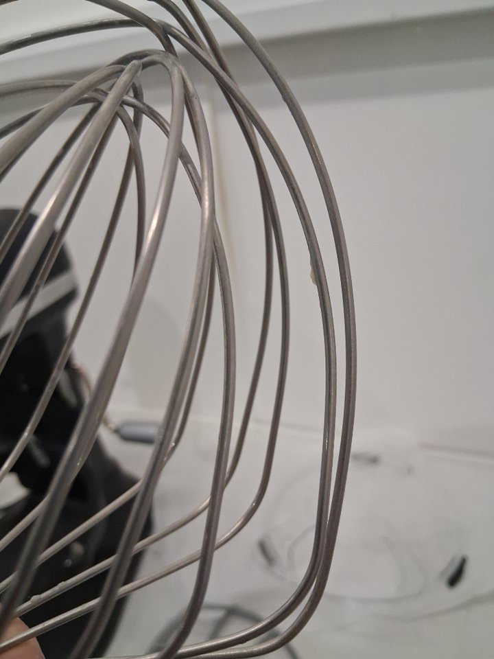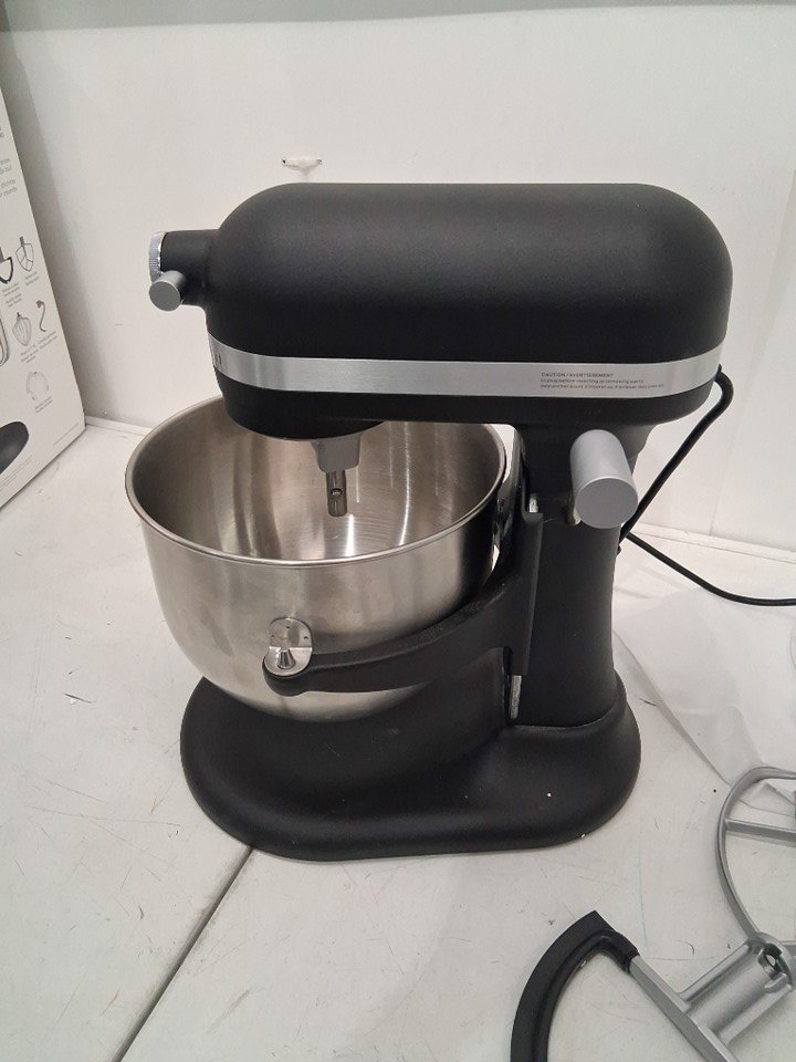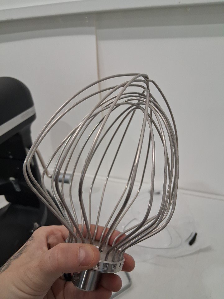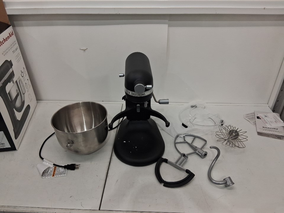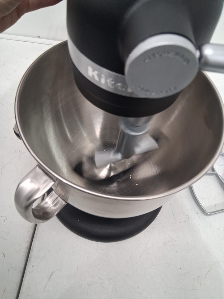 Mixer has scratches on it, stainless steel bowl has scratches in it, whisk is warped and has some food residue on it. Has been tested for power and function