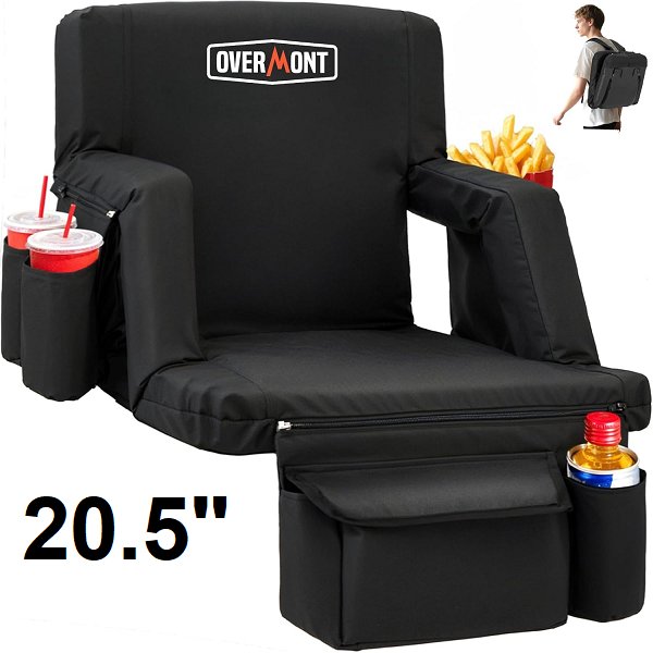 Overmont stadium seat with back support extra wide cushion and backpack straps - 20.5" - Black