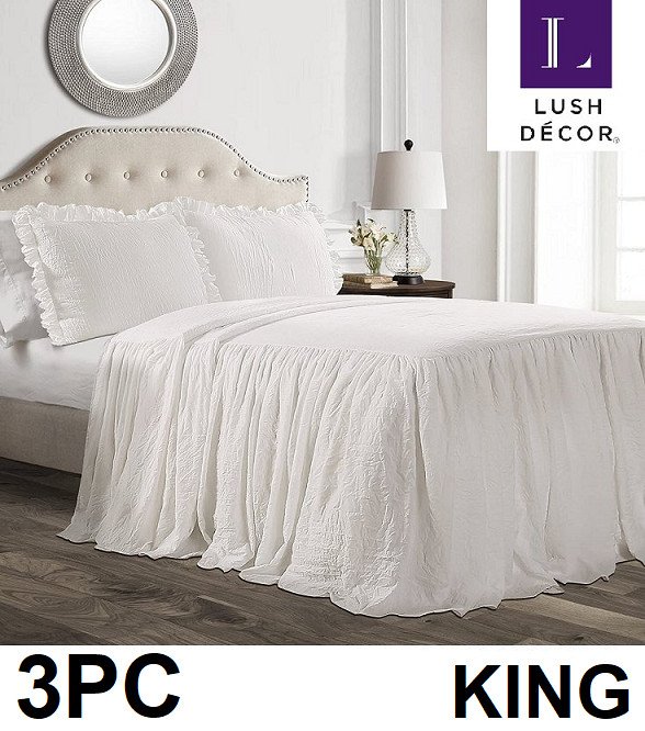 3PC LUSH DECOR RUFFLE SKIRT BEDSPEARD, LIGHTWEIGHT SHABBY CHIC FARMHOUSE STYLE - KING - WHITE