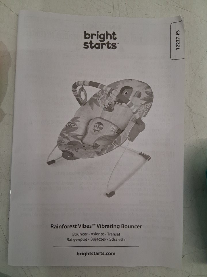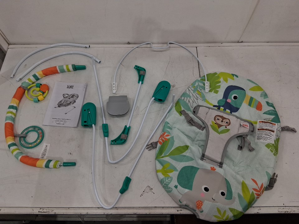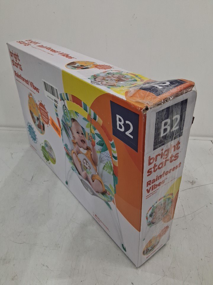 BRIGHT STARTS RAINFOREST VIBES PORTABLE 3-POINT HARNESS VIBRATING BOUNCER WITH TOY-BAR - RAINFOREST VIBES - (MODEL: 12227)