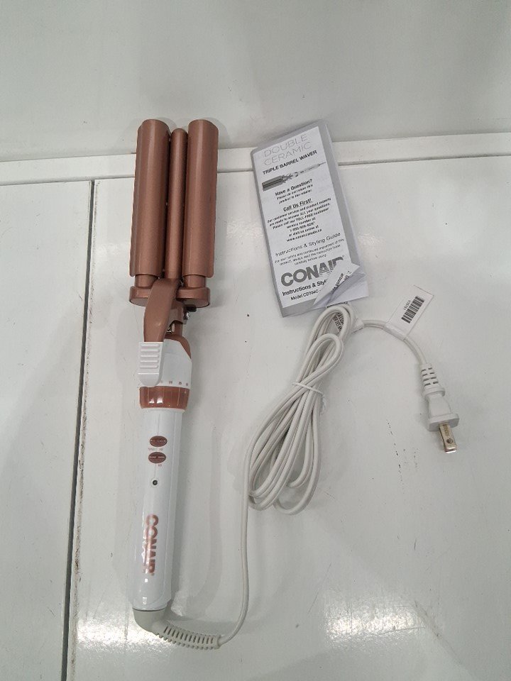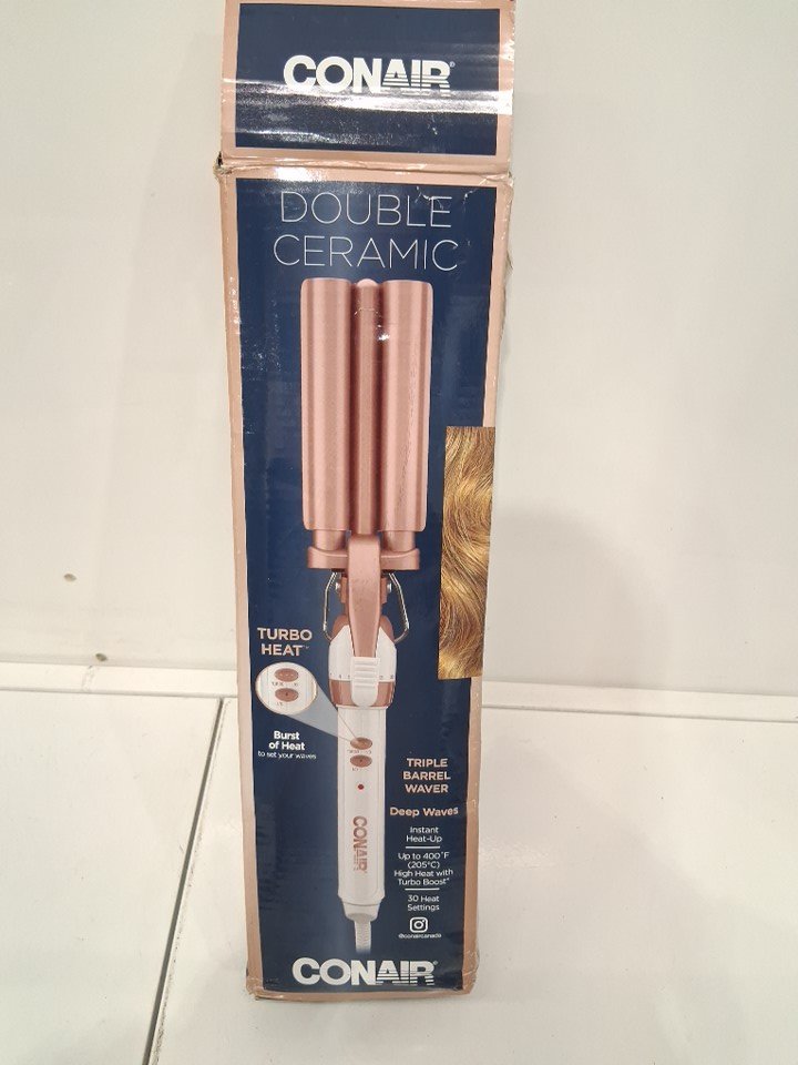 CONAIR DOUBLE CERAMIC TRIPLE BARREL CURL STYLING WAVER FOR DEEP WAVES - 3/4" BARRELS - WHITE/ROSE GOLD (MODEL: CD704C)