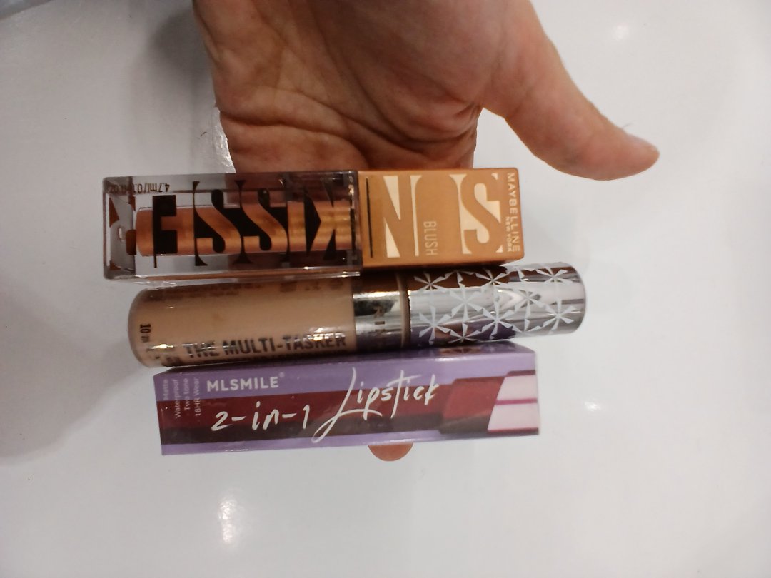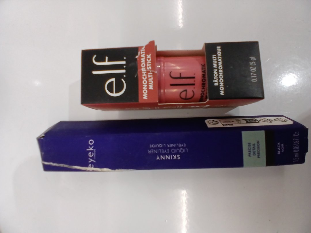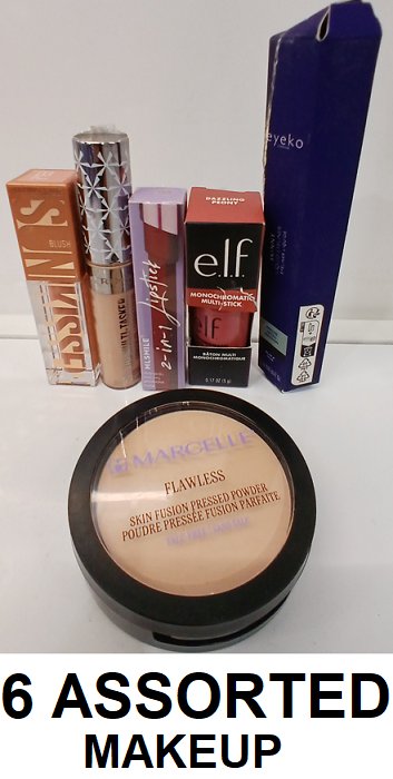 6 ASSORTED MAKEUP PRODUCTS- ASSORTED COLORS, TYPES AND BRANDS - eyeliner/ lipstick/ powder/ multi-stick/ corrector