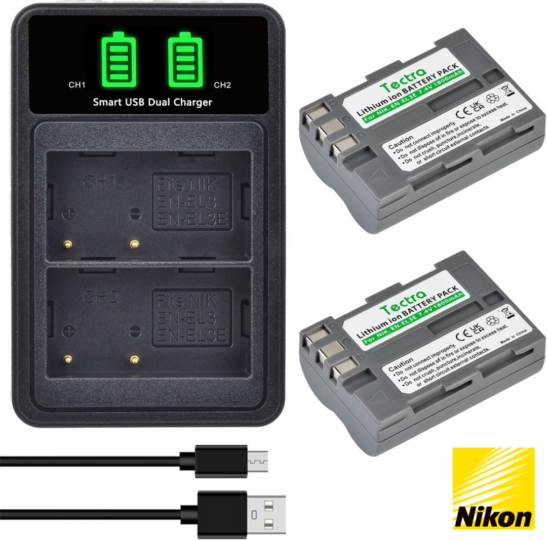2PK TECTRA LI-ION BATTERY KIT WITH CHARGER AND ADAPTERS, BATTERY REPLACEMENT KIT FOR nikon d series cameras